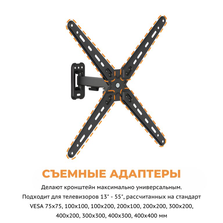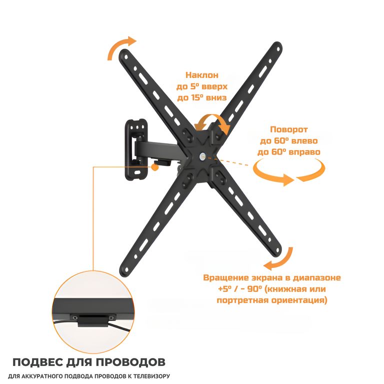 Данная модель кронштейна имеет множество степеней свободы, позволяет регулировать угол наклона вашего телевизора в диапазоне до 5° вверх и до 15° вниз, повернуть экран телевизора до 60° в каждую сторону, а функция вращения экрана в диапазоне +5° / - 90° позволит зафиксировать телевизор в книжной или портретной ориентации.