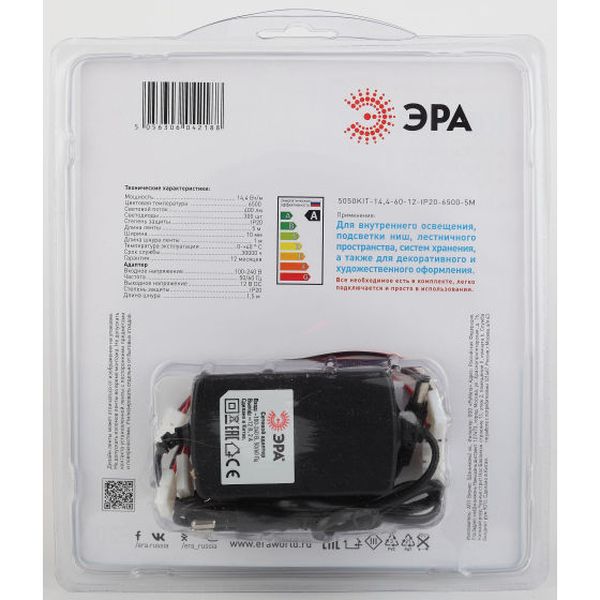 Лента светодиодная ЭРА 5050kit-14,4-60-12-IP20-6500-5m