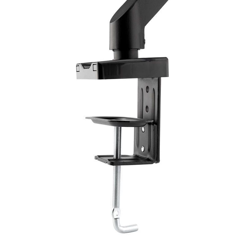 Фиксация кронштейна на столе осуществляется посредством струбцины. На корпусе предусмотрена система скрытой укладки кабеля внутри корпуса кронштейна. В комплекте поставляются все необходимые крепления для установки изделия, что обеспечивает удобный и быстрый монтаж. Поддержка крепления стандарта VESA: 75х75/100х100.