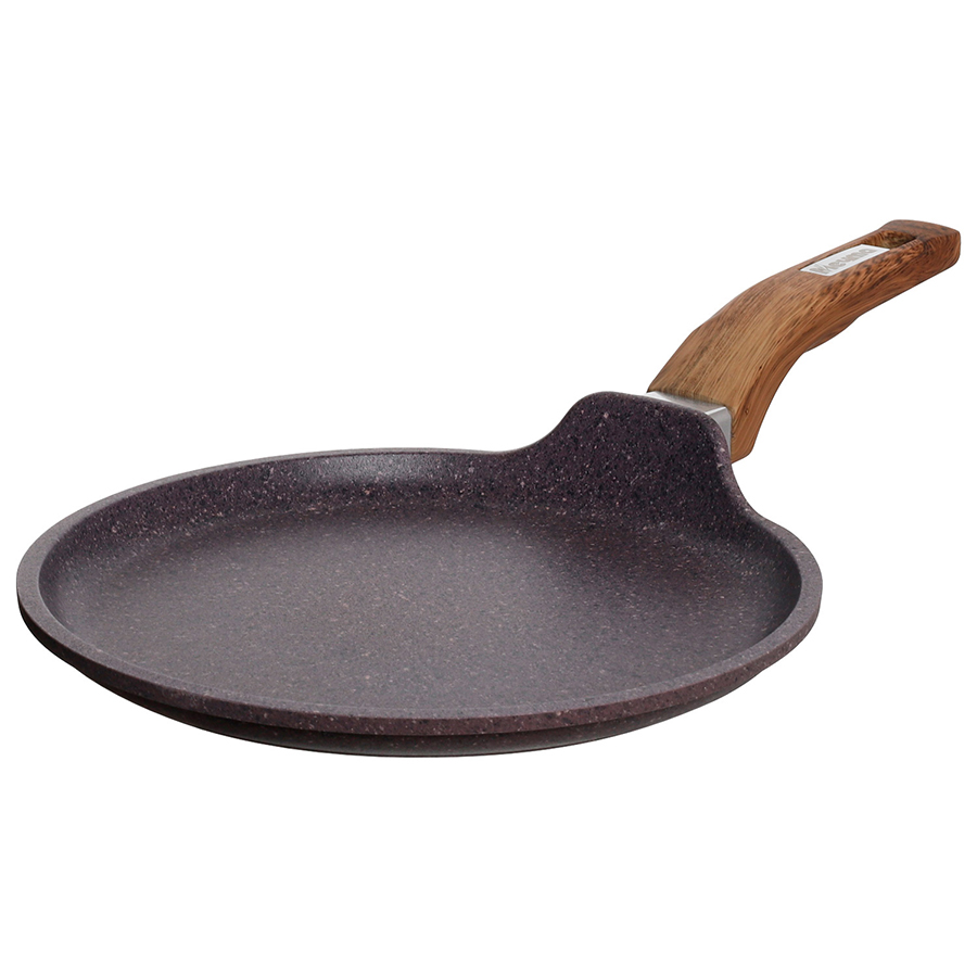 Блинная сковорода выполнена из прочного материала с антипригарным гранитным покрытием, что обеспечивает равномерный нагрев и легкое переворачивание теста без пригорания. Её тонкое и плоское дно идеально подходит для равномерного распределения теста и приготовления тонких, золотистых блинов.