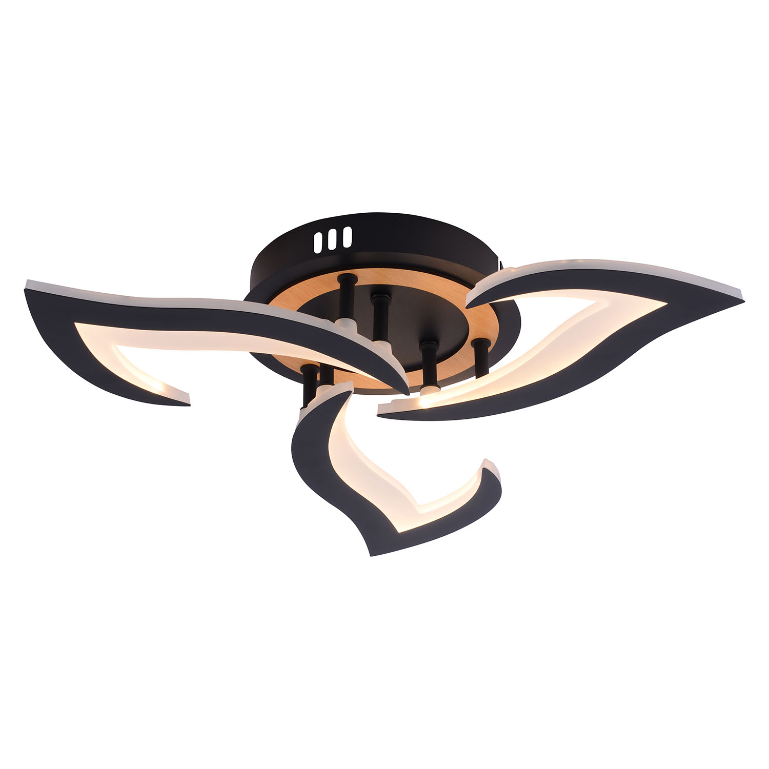 Серия черных светодиодных потолочных светильников с элементами натурального дерева включает модели мощностью 42 и 84 Вт. В комплекте пульт ДУ для удобного регулирования яркости и цветовой температуры от 3000 до 6250 К, позволяя настроить освещение под любые потребности и атмосферу.