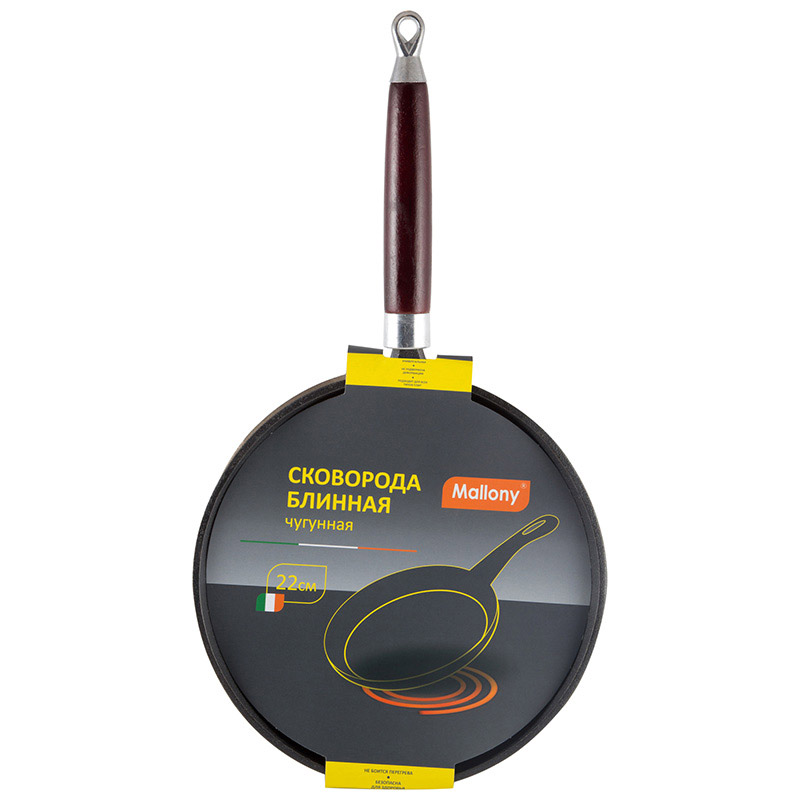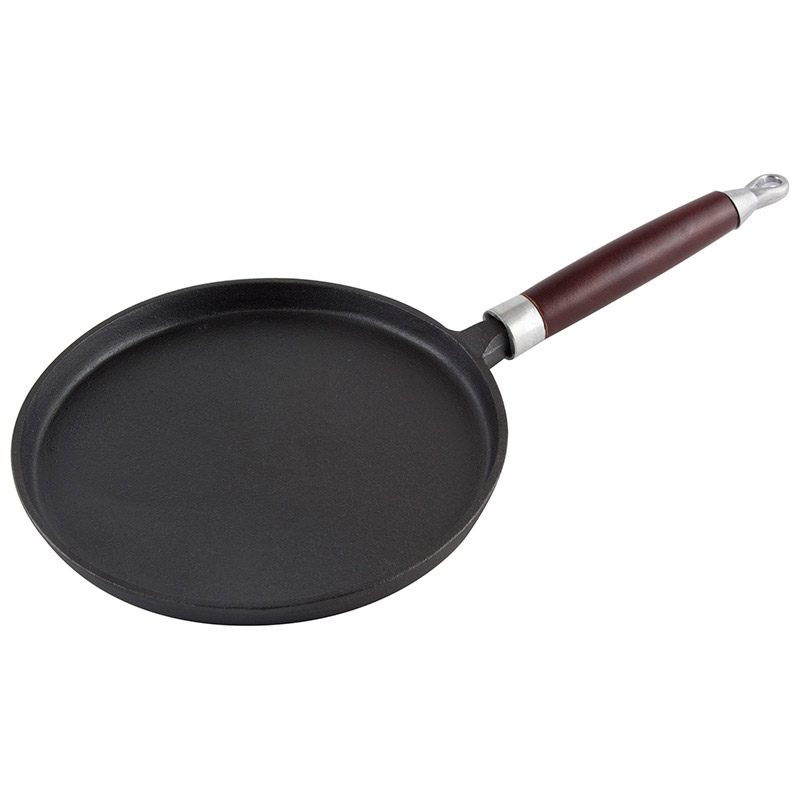 Блинная сковорода изготовлена из качественного чугуна и оснащена удобной деревянной ручкой. Обладает отличными антипригарными свойствами, равномерно распределяет тепло и позволяет готовить идеальные блины и оладьи даже без добавления масла. Подходит для всех типов плит, включая индукционные, газовые, электрические и керамические. Материал изделия абсолютно безопасен для здоровья.