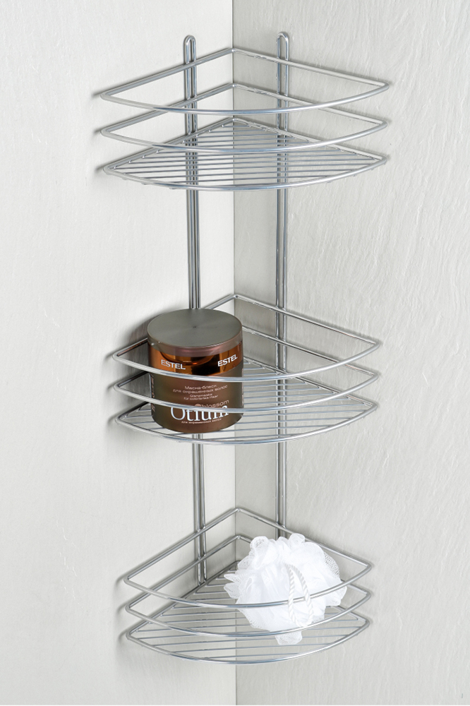 Полка угловая трехэтажная серая FX-710-3 - изящный влагостойкий аксессуар с защитой от нагрузок и царапин. Скругленные формы минимизируют вероятность травмирования. Решетка конструкции ускоряет процесс высыхания. Материал полки — стальная основа с порошковым покрытием эффекта муар. Монтаж осуществляется навешиванием на винты.