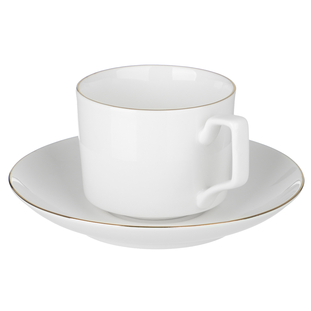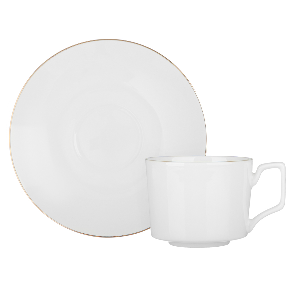 Изысканный и элегантный чайный сервиз, идеально подходящий для повседневного чаепития или утреннего кофейного ритуала. Чистый белый фарфор с утончённой золотой отводкой придаёт чашкам благородный вид, создавая атмосферу утончённости и роскоши за столом.