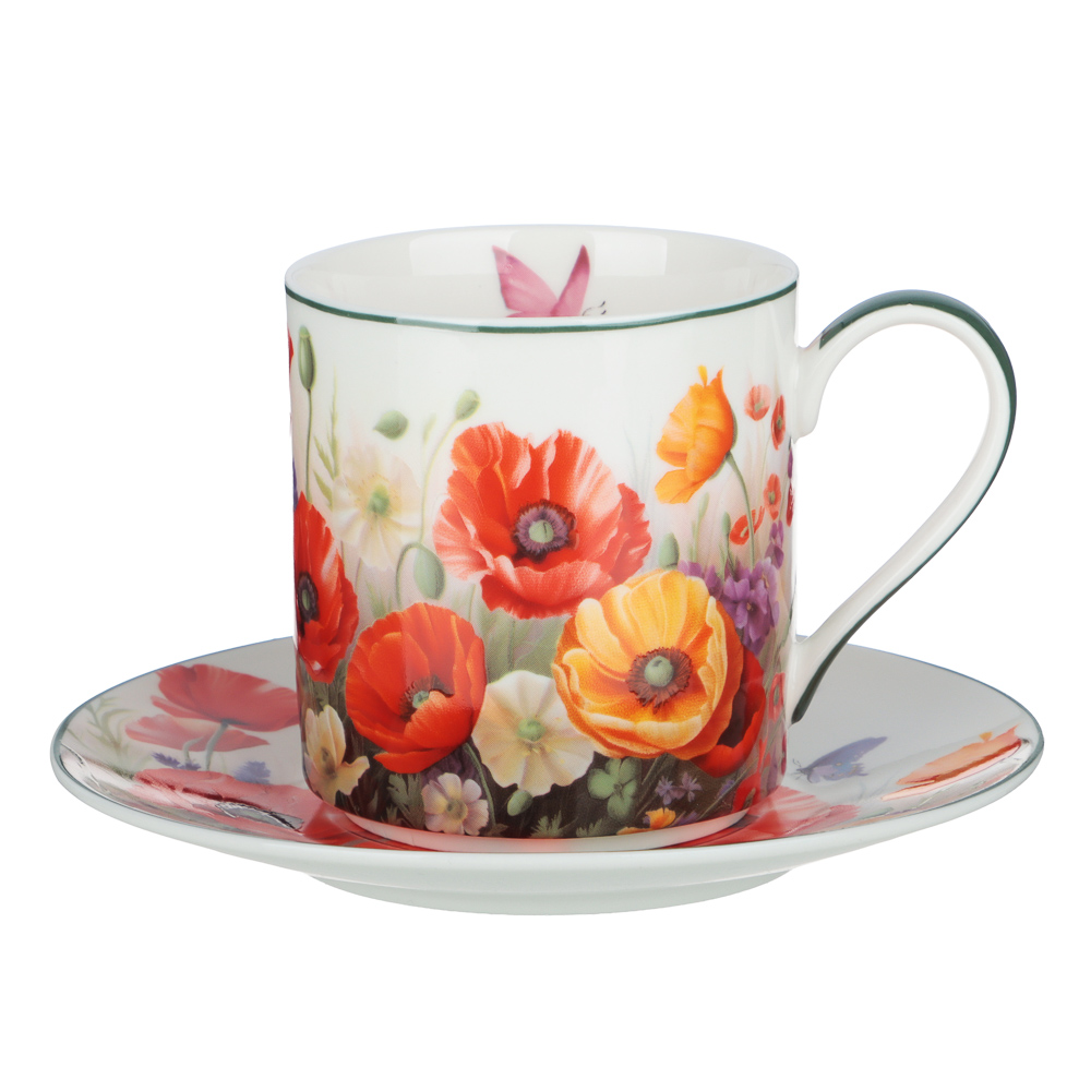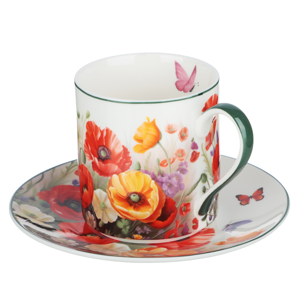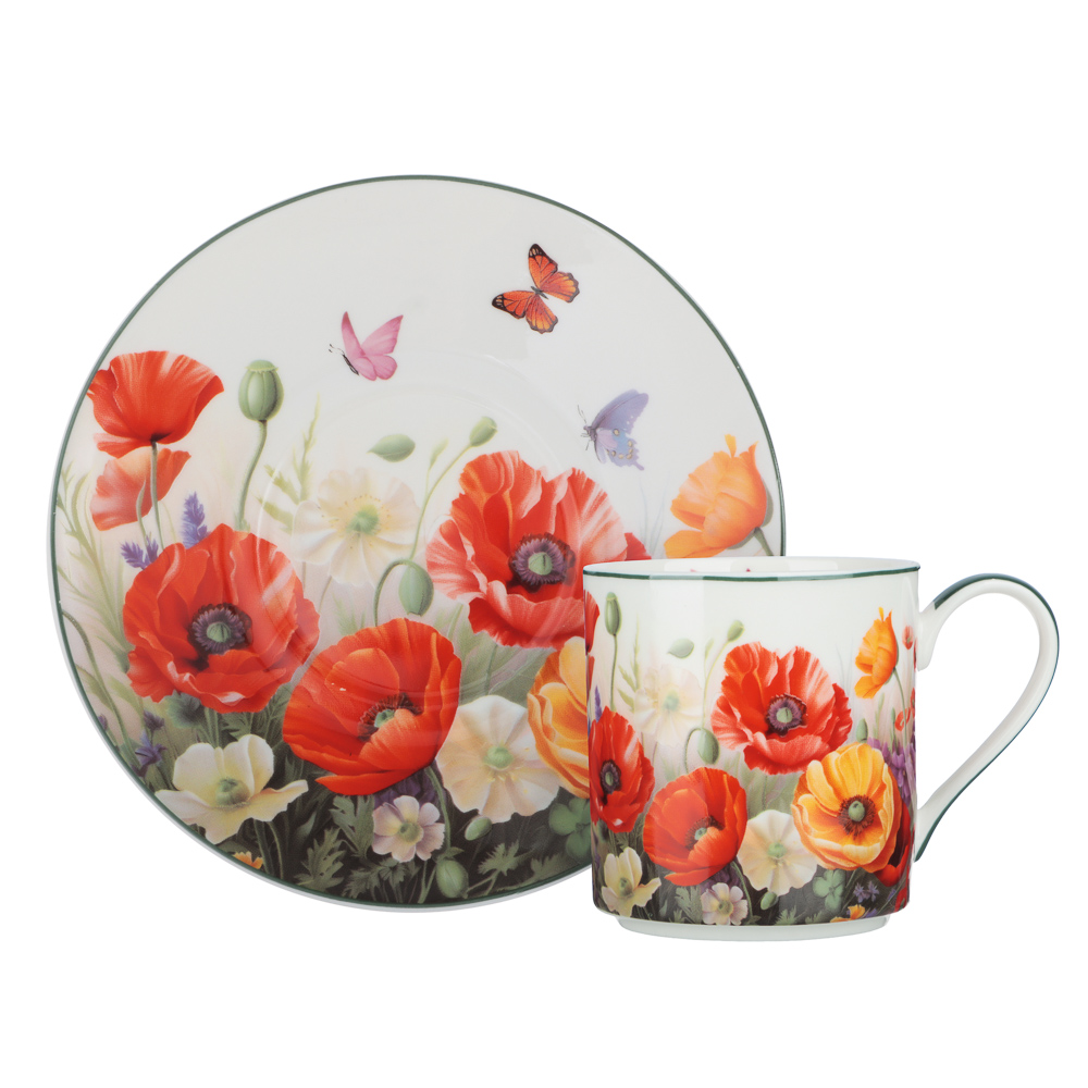 Фарфоровая чайная пара с ярким цветочным принтом, которая создаст особую атмосферу за завтраком или во время дружеских посиделок, превращая чаепитие в маленький праздник. Яркие алые маки на белом фарфоре смотрятся выразительно, оживляя сервировку.