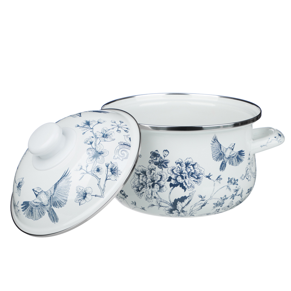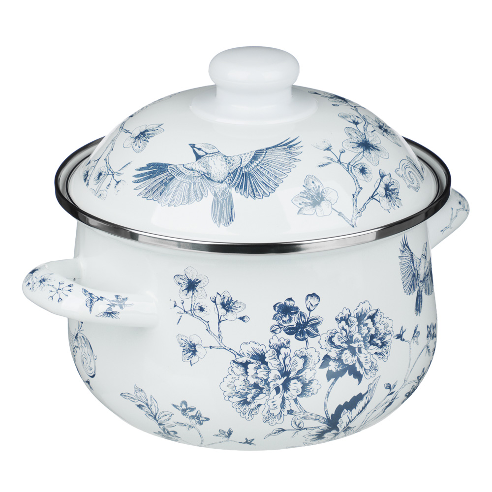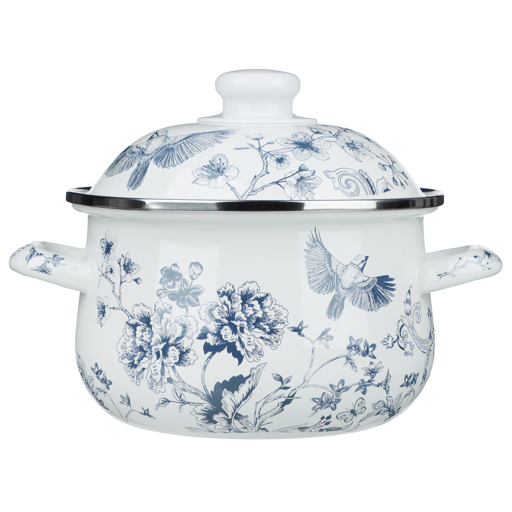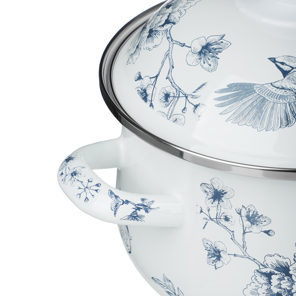 Ненагревающаяся ручка на крышке выполнена из термостойкого пластика. Лаконичный однотонный рисунок в виде цветов и птицы синего цвета создает на кухне атмосферу спокойствия и уюта, добавляя выразительности в интерьер. Кастрюля подходит для всех типов плит, включая индукцию.