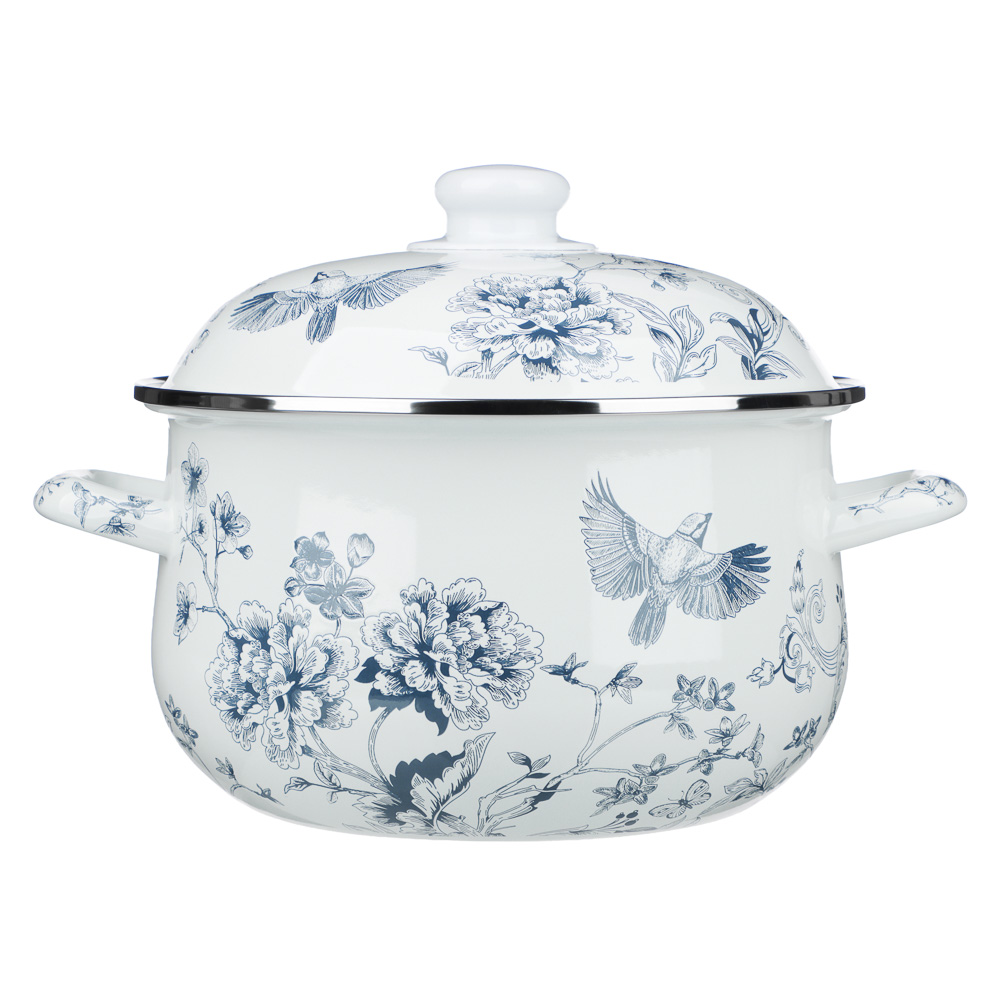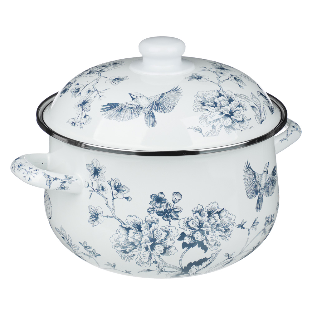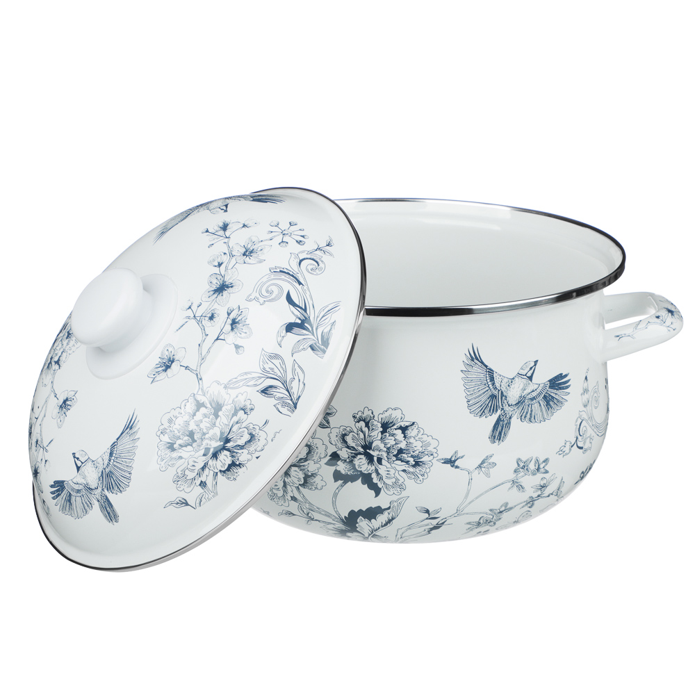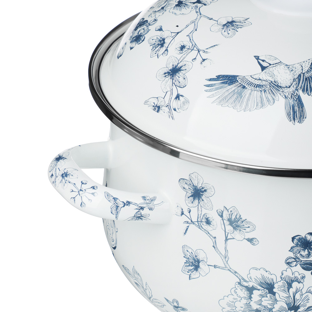 Ненагревающаяся ручка на крышке выполнена из термостойкого пластика. Лаконичный однотонный рисунок в виде цветов и птицы синего цвета создает на кухне атмосферу спокойствия и уюта, добавляя выразительности в интерьер. Кастрюля подходит для всех типов плит, включая индукцию.