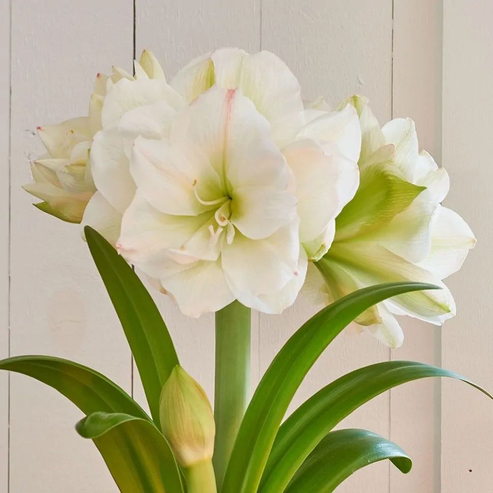 Амариллис махровый Вайт Амадеус - великолепный сорт, впечатляет своей величиной и изящностью. Растение высотой 50-70 см с крупными махровыми цветками диаметром до 20 см. На одном цветоносе может быть от 2 до 4 цветков. Цветы сияющие, привлекают внимание своими оттенками и гармонией форм. Искрящиеся белые лепестки украшены нерегулярными светло-розовыми полосками различной интенсивности, что придает цветку уникальную индивидуальность.