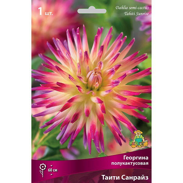 Среднерослая полукактусовая георгина Tahiti Sunrise удивит Вас своими яркими и контрастными соцветиями. У полукактусовых георгин лепестки (язычковые цветки) более широкие у основания и свернуты в трубочку только на половину (или менее) длины, как правило прямые и расходящихся во все направления от центра. Форма цветка также махровая. Полукактусовые георгины являются как бы переходным вариантом между кактусовыми и декоративными георгинами. Желтые бутоны окрашены по краю лепестков в розово-малиновый цвет. Георгина буквально сияет! Этим цветком можно украсить любые клумбы, к тому же его можно использовать для срезки. Георгина Tahiti Sunrise оживит своим заводным "характером" любой цветник.