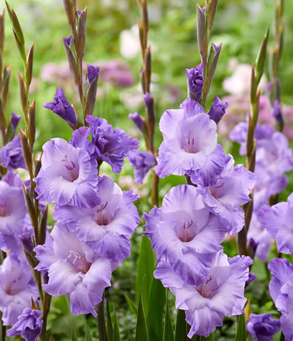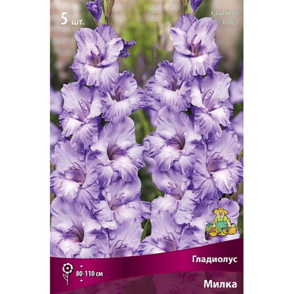 Гладиолус крупноцветковый Милка - высота растения 80-110 см. Цветок нежно-сиренево-голубой. В течение лета растениям необходимо обеспечить регулярный полив, рыхление и 2-3 подкормки минеральными удобрениями. Срезку лучше проводить утром или вечером. В открытом грунте растение не зимует. Луковицы выкапывают осенью до наступления устойчивых холодов, просушивают и хранят в сухом прохладном месте.