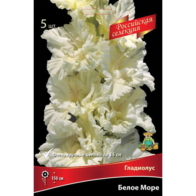 Гладиолус гофрированный Белое Море - клубнелуковичное растение высотой 50-150 см с вертикальным стеблем и линейными или мечевидными листьями. Цветки воронковидные, собраны в колосовидное соцветие до 80 см длиной, самых разнообразных окрасок, могут быть простыми или гофрированными.