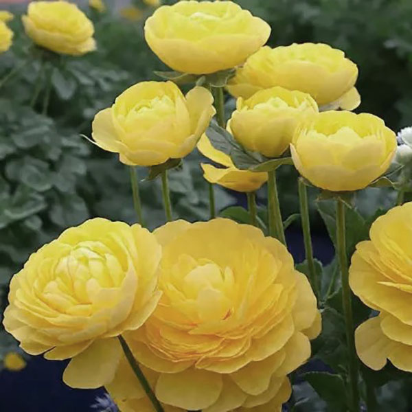 Лютик (Ранункулюс) азиатский Йеллоу - высота растения 45-50 см. Цветы полумахровые ярко-желтые. Лепестки шелковистые, блестящие. Цветут в течение месяца, после чего листва отмирает и растение уходит на покой. Изысканно смотрятся в цветниках и контейнерной культуре.