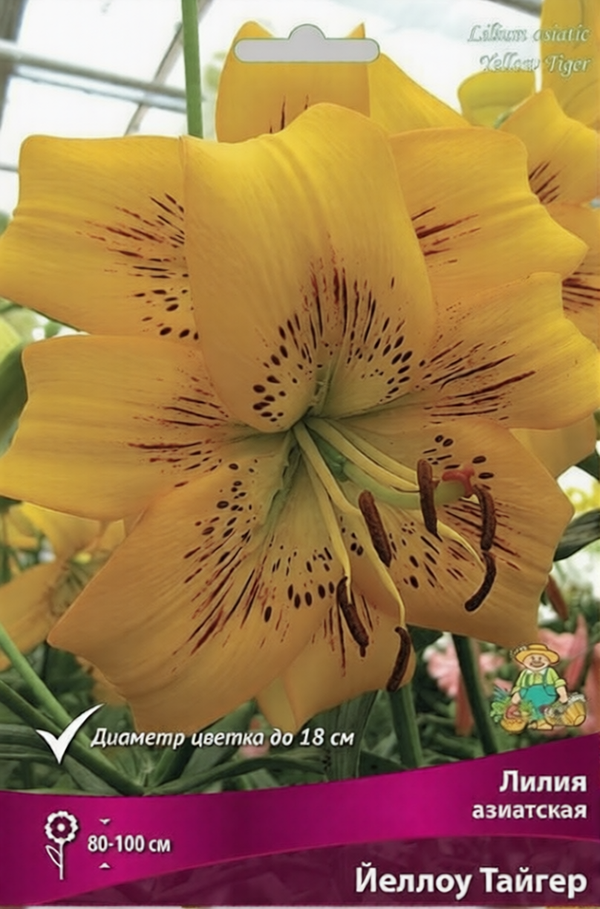 Лилии - многолетние луковичные растения. Высота у разных видов от 30 до 200 см. Есть сорта для выращивания в горшках. Азиатские гибриды – Неприхотливые, выносливые растения, отличаются морозостойкостью, быстро и легко размножаются. Цветки разнообразны по форме и окраске. Цветут во второй половине июня-июле. Пригодны для выгонки во внесезонное время. Аромат отсутствует. Зимостойкость хорошая. Йеллоу Тайгер - лилия тигровая. Высота растения 100-120 см. Цветок КРУПНЫЙ, кремово-желтый, красно-оранжевый крап и пыльники, диаметр цветка до 25 см.