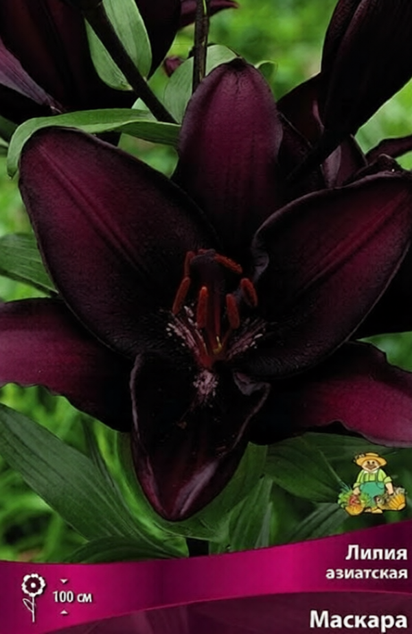 Лилии - многолетние луковичные растения. Высота у разных видов от 30 до 200 см. Есть сорта для выращивания в горшках. Азиатские гибриды – Неприхотливые, выносливые растения, отличаются морозостойкостью, быстро и легко размножаются. Цветки разнообразны по форме и окраске. Цветут во второй половине июня-июле. Пригодны для выгонки во внесезонное время. Аромат отсутствует. Зимостойкость хорошая. Маскара - темно-бордовый с серо-фиолетовым оттенком и мелким черным крапом у центра, диаметр цветка 12-14 см.