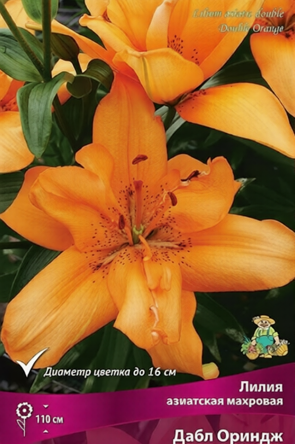 Лилии - многолетние луковичные растения. Высота у разных видов от 30 до 200 см. Есть сорта для выращивания в горшках. Азиатские гибриды – Неприхотливые, выносливые растения, отличаются морозостойкостью, быстро и легко размножаются. Цветки разнообразны по форме и окраске. Цветут во второй половине июня-июле. Пригодны для выгонки во внесезонное время. Аромат отсутствует. Зимостойкость хорошая. Дабл Ориндж - высота растения 110 см, цветок оранжевый с коричневым крапом, махровый.