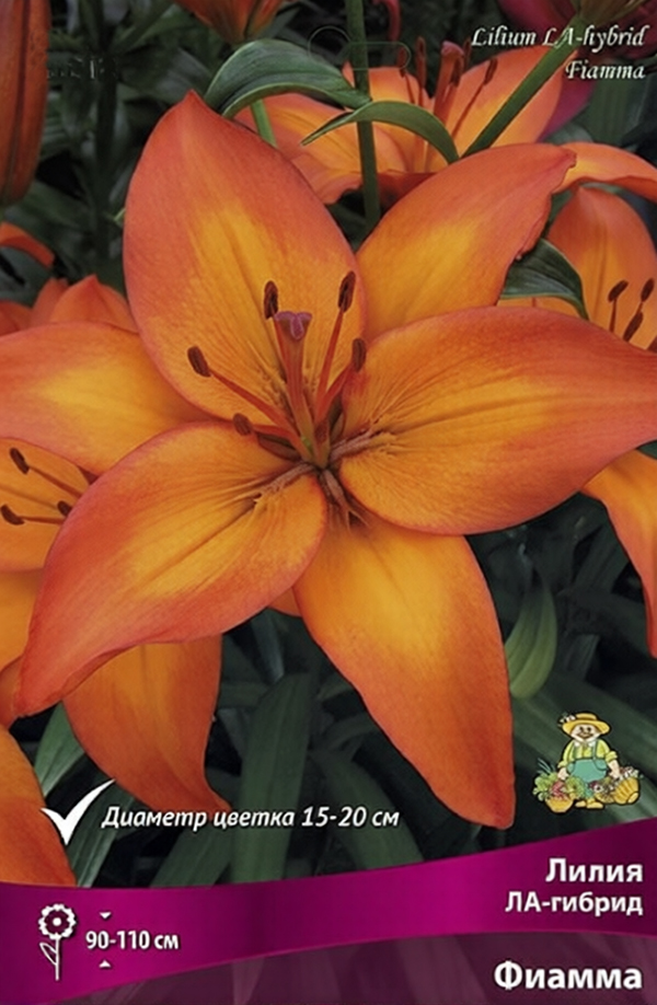 Лилии - многолетние луковичные растения. Высота у разных видов от 30 до 200 см. Есть сорта для выращивания в горшках. ЛА-гибриды – выведены от скрещивания Лонгифлорум гибридов и Азиатских гибридов. От Лонгифлорум гибридов они унаследовали крупный цветок и восковидную фактуру лепестка, а от Азиатских – зимостойкость. Они прекрасно растут в различных климатических условиях обширной территории России. Зацветают в середине июля, цветут обильно и продолжительно. Легко поддаются выгонке. Фиамма - высота растения 110 см. Цветок яркий, КРУПНЫЙ, красно-оранжевый, у центра темно-желтый рисунок, напоминающий языки пламени, диаметр цветка 20 см.