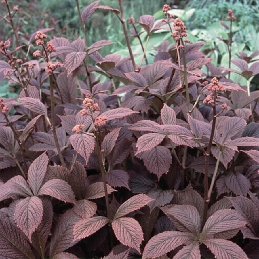 Роджерсия перистая - это очень крупное, поразительно красивое, можно сказать, экзотическое растение, которое всегда будет доминировать в вашем цветнике и привлекать к себе внимание. Высота растений 50-60 см, во время цветения вместе с соцветием 100-120 см. Листья перистораздельные на прочных крепких черешках длиной от 40 до 100 см. При распускании они пурпурные, позже – темно-зеленые, с рельефным жилкованием. Стебель сильно разветвленный. Соцветие — сложная метелка длиной 25-30 см с мелкими белыми или розовыми ароматными цветками. Цветет в течение 20-25 дней с первой декады июля.