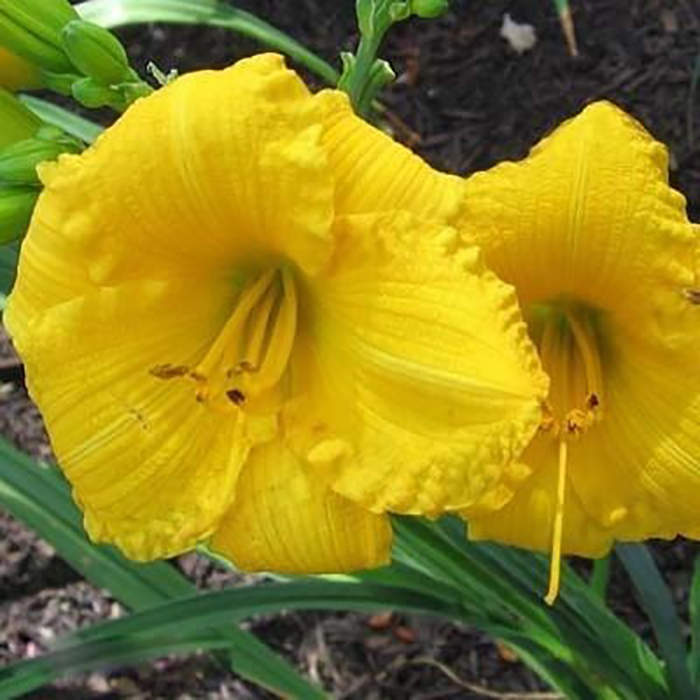 Лилейники – корневищные травянистые многолетники с мочковатыми мясистыми корнями. Мечевидно-изогнутые листья образуют плотные кусты. Цветки по форме похожи на цветки лилий, крупные, чаще воронковидные, шестираздельные, с небольшой трубкой, собраны по 2-10 в раскидистые соцветия. Каждый цветок живет один день, но множество цветков на взрослом растении обеспечивают длительное цветение. В пасмурную прохладную погоду цветки живут до шести дней. Общая продолжительность цветения куста 25 и более дней. Лилейник один из самых малотребовательных многолетников. Зимостоек, засухоустойчив, жизнестоек. Сохраняет декоративность с весны до глубокой осени. На зиму можно не обрезать, лишь подсыпать к кустам торфокомпост. На одном месте может расти очень долго, образуя крупные, широкие кусты. Техас Санлайт – высота растения 65 см, цветок желтый. Цветение июнь-июль.