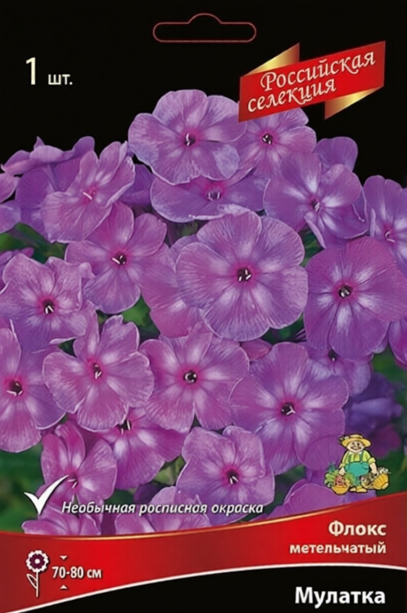 Флокс метельчатый Мулатка - уникальный сорт отечественной селекции – настоящее воплощение грациозности и благородства. Куст компактный, сильный, высотой 70-80 см. Стебли крепкие, прямостоячие, не требуют подвязки и дополнительного крепления. Изюминкой сорта является необычная окраска цветка: основной фон сиренево-пурпурный с густым пепельно-серебристым налетом, мягко украшен тёмно-лиловым глазком в окружении размытого белоснежного кольца. Оттенки лепестков варьируются от светло-фиолетовых до глубоких пурпурных, часто сопровождаются белыми участками и мягкими полутоновыми границами, объединяя всю композицию в единое целое. Маленькие цветочки диаметром 3,5 см собраны в округлые, плотные соцветия средней величины, создавая мастерски организованные группы ярких акцентов.