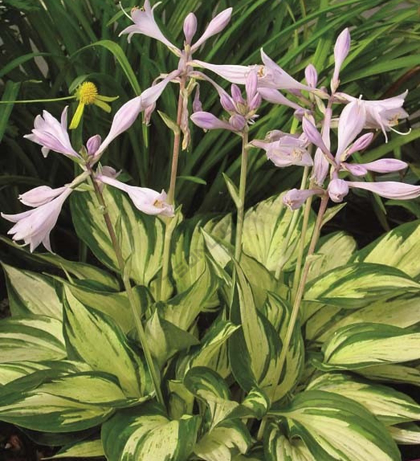 Хосты - многолетние растения с компактным или коротковетвистым корневищем. Листья прикорневые, на черешках, сравнительно крупные, разной окраски и формы: зеленые, голубовато-сизые, пестрые, от узколанцетных до широкояйцевидных. Цветоносы почти не облиственные, крупные, у некоторых видов до 120 см высотой. Цветки воронковидные или воронковидно-колокольчатые, сиреневые, фиолетовые, реже белые, собраны в кистевидное, часто однобокое соцветие. Революшн - высота растения 50 см, ширина 100 см. Листья кремовые с зелеными крапинками и широкой темно-зеленой каймой.