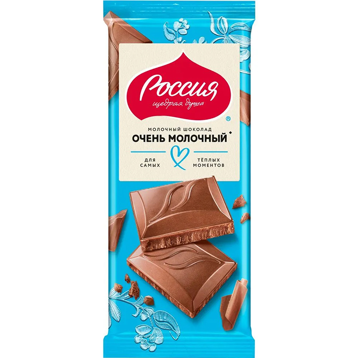 Шоколад Очень молочный от бренда Россия Щедрая душа – это нежная классика, способная растопить ваши сердца. Отборное молоко, качественные какао-бобы и элегантный дизайн упаковки доставят вам эстетические и гастрономическое удовольствие. Изящная обновленная форма дольки шоколада раскрывает весь яркий и насыщенный молочный вкус. Кусочки шоколада медленно таят во рту, продлевая ваше удовольствие.