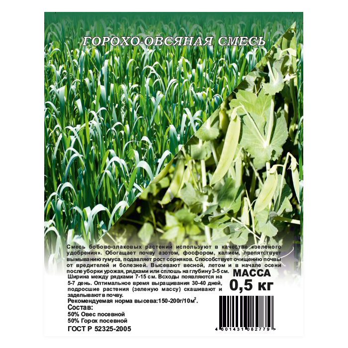 Норма высева: 150-200г/10м². Состав: 50% Овес посевной, 50% Горох посевной.