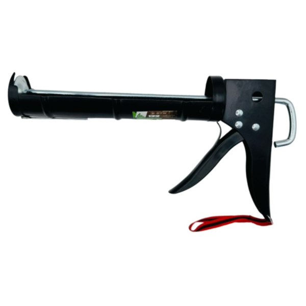 Пистолет изготовлен из высококачественной стали, окрашен в черный цвет. Мощный шток с храповым механизмом подходит для любого вида герметика. В пистолет встроен нож для срезания части колпачка картриджа. В передней части находится игла для очистки носика картриджа от застывшего герметика. На ручке расположен шнурок для удобного хранения пистолета.