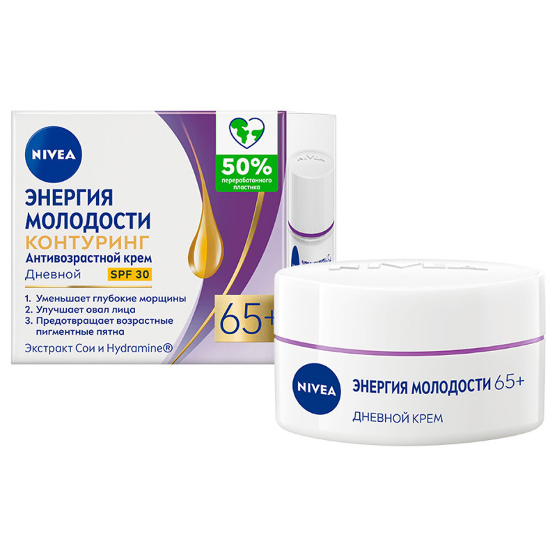 Откройте для себя линию антивозрастных кремов для лица «Энергия Молодости» от бренда NIVEA, бренда со 100-летним опытом в уходе за кожей. Дневной крем «Энергия Молодости» Контуринг 65+ с SPF 30 от бренда NIVEA улучшает овал лица, заметно сокращает глубокие морщины и обеспечивает интенсивное увлажнение.