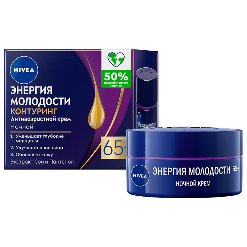 Откройте для себя линию антивозрастных кремов для лица «Энергия Молодости» от бренда NIVEA, бренда со 100-летним опытом в уходе за кожей. Ночной крем «Энергия Молодости» Контуринг 65+ от бренда NIVEA способствует процессу регенерации требовательной зрелой кожи, заметно уменьшает поверхностные и глубокие морщины и стимулирует процесс обновления кожи в ночное время. Крем для лица содержит экстракт сои, масло жожоба и пантенол для интенсивного увлажнения кожи.
