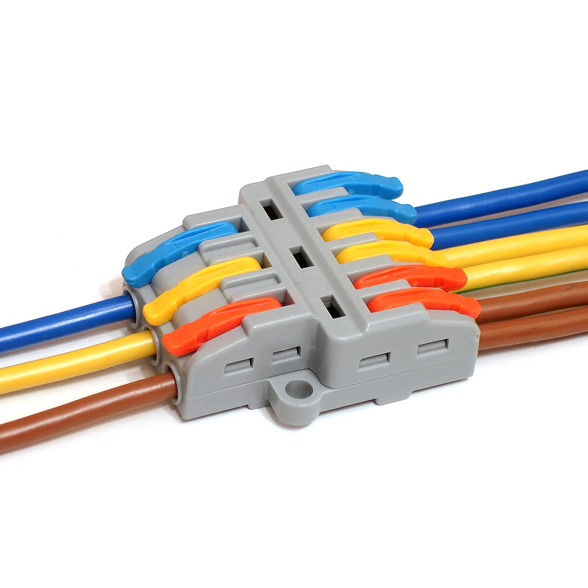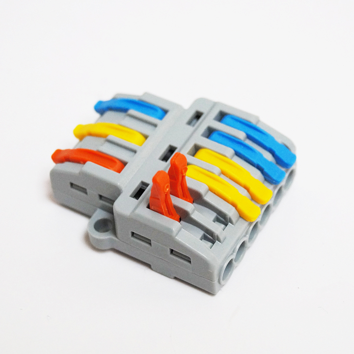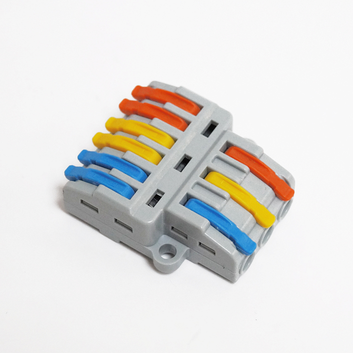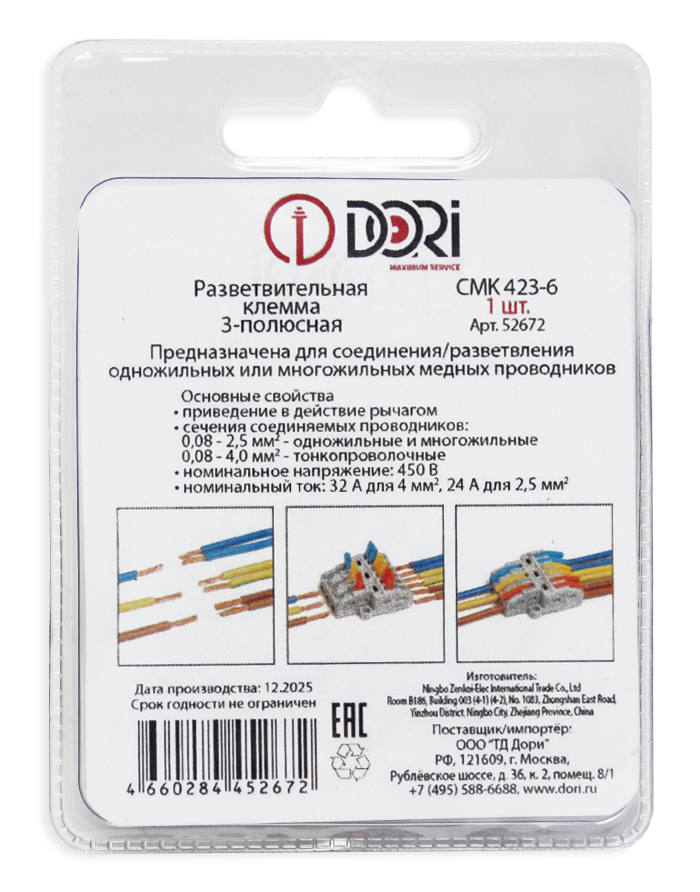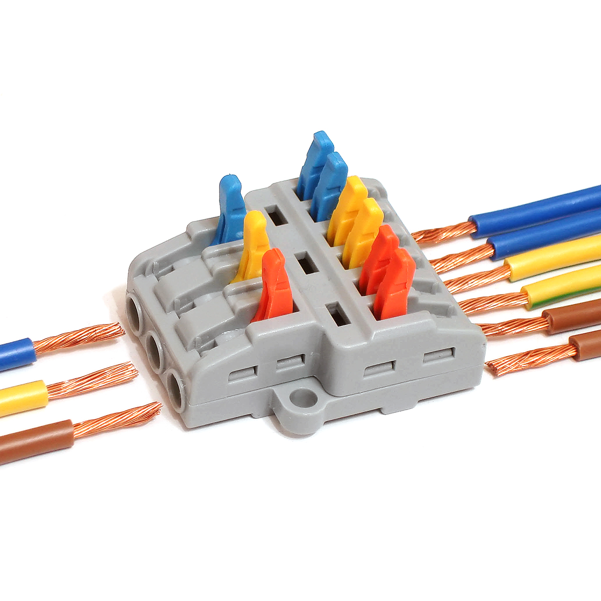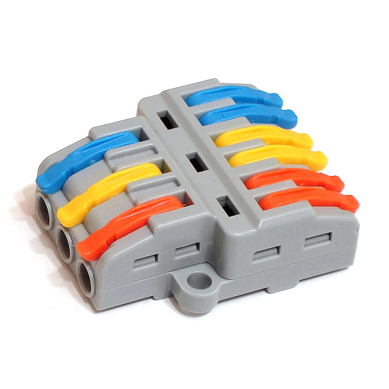 Трехполюсная разветвительная клемма Dori СМК 423-6 с рычажковым механизмом предназначена для быстрого и надежного соединения одножильных и многожильных медных проводов.