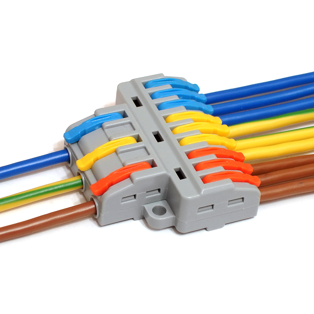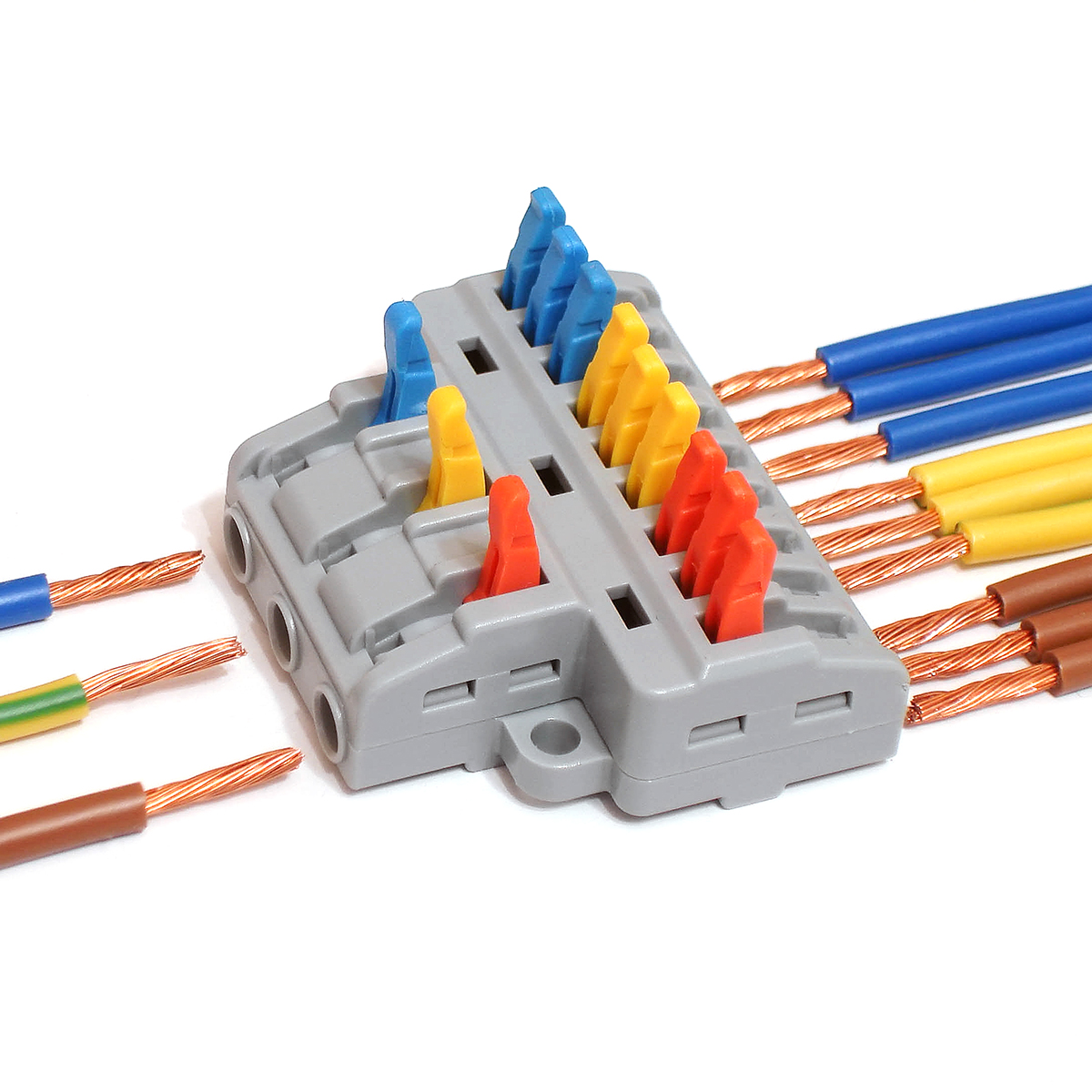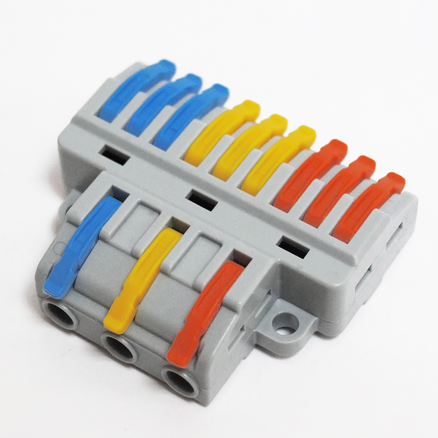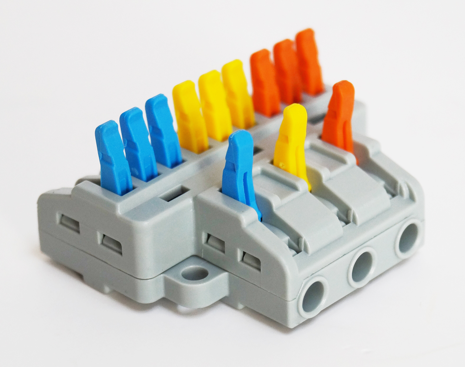 Трехполюсная разветвительная клемма Dori СМК 423-9 с рычажковым механизмом предназначена для быстрого и надежного соединения одножильных и многожильных медных проводов.