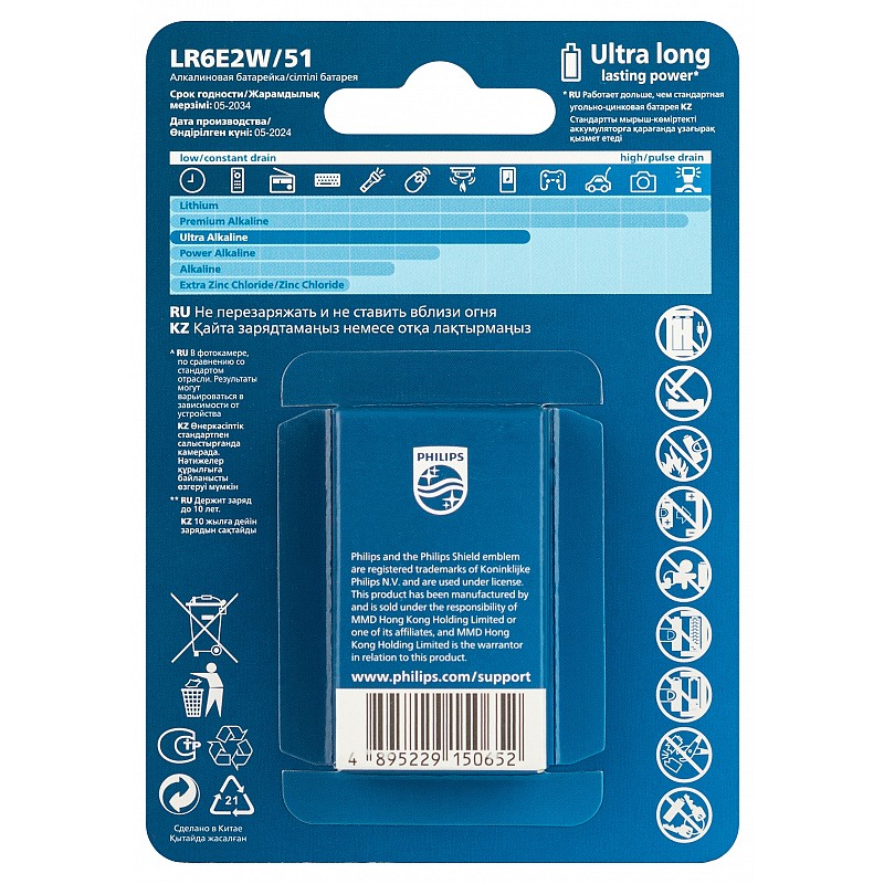 Щелочные (алкалиновые) батарейки Philips Ultra в типоразмере AA LR6 подходят для большинства энергоемких устройств. Они обеспечивают стабильную работу благодаря улучшенной формуле, которая дает больше энергии по сравнению с обычными солевыми батарейками.