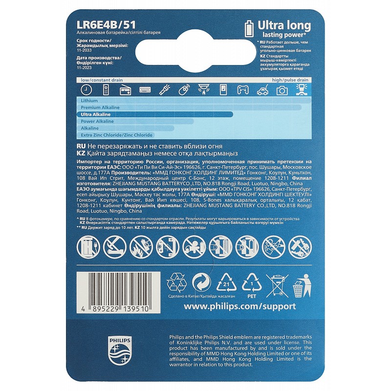 Щелочные (алкалиновые) батарейки Philips Ultra в типоразмере AA LR6 подходят для большинства энергоемких устройств. Они обеспечивают стабильную работу благодаря улучшенной формуле, которая дает больше энергии по сравнению с обычными солевыми батарейками.