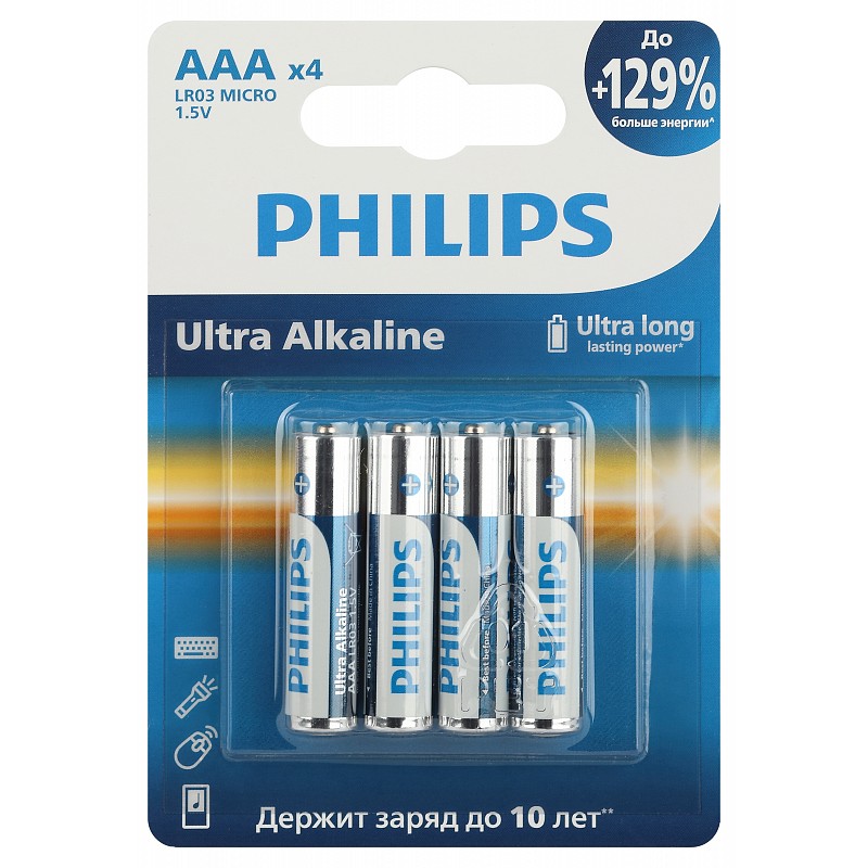 Щелочные (алкалиновые) батарейки Philips Ultra в типоразмере AAA LR03 подходят для большинства энергоемких устройств. Они обеспечивают стабильную работу благодаря улучшенной формуле, которая дает больше энергии по сравнению с обычными солевыми батарейками.