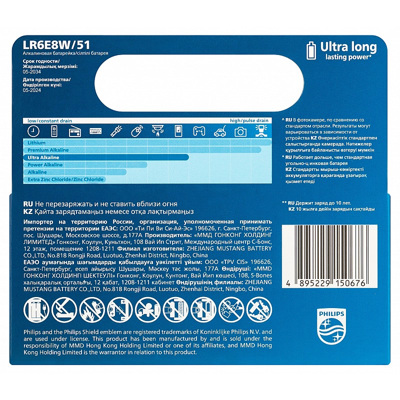 Щелочные (алкалиновые) батарейки Philips Ultra в типоразмере AA LR6 подходят для большинства энергоемких устройств. Они обеспечивают стабильную работу благодаря улучшенной формуле, которая дает больше энергии по сравнению с обычными солевыми батарейками.