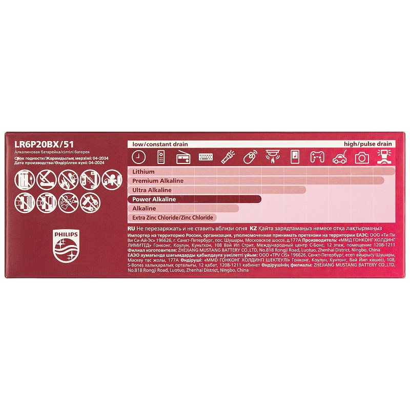 Благодаря улучшенной щелочной технологии эти элементы работают дольше обычных солевых батареек и сохраняют заряд до 10 лет. Мощность батареек Philips Power AA на 109% превышает отраслевые стандарты. Батарейки безопасны для окружающей среды: в их составе нет кадмия, ртути и свинца.