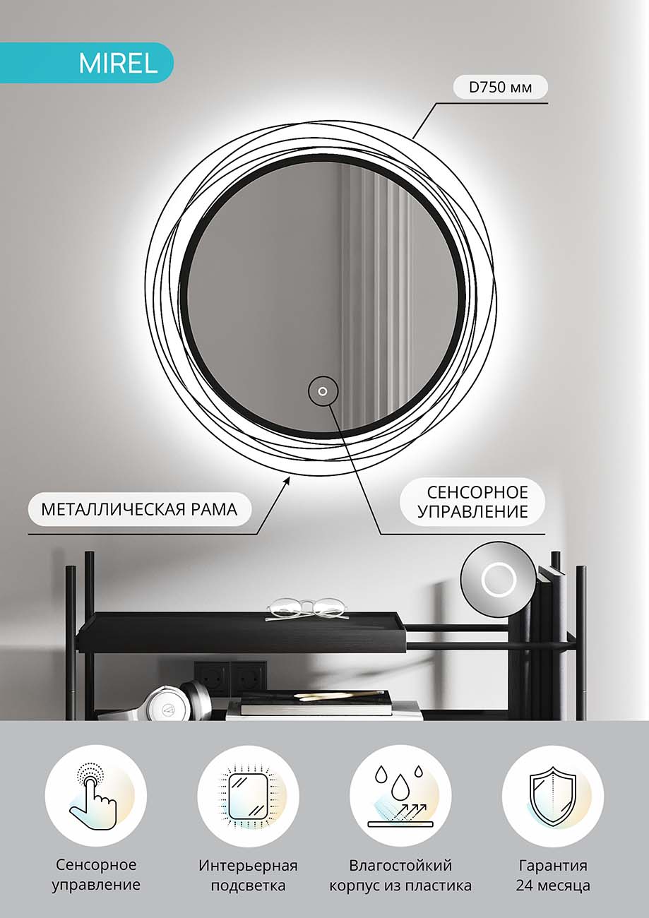 Зеркало с подсветкой "Mirel Led" — стильное и функциональное дополнение, которое придаст вашему пространству уникальность. Зеркало имеет открытую ореольную подсветку холодного белого цвета, которая дает дополнительное освещение в интерьере и создает эффект парящего зеркала. Подсветка включается с помощью сенсора со встроенным диммером; яркость регулируется длительностью касания.