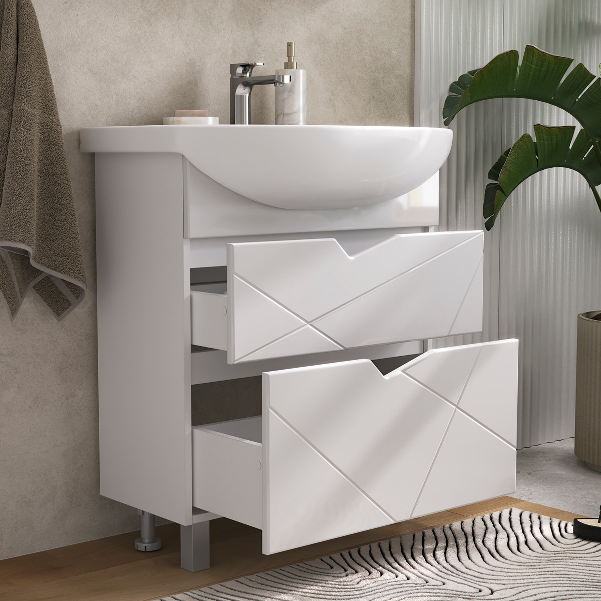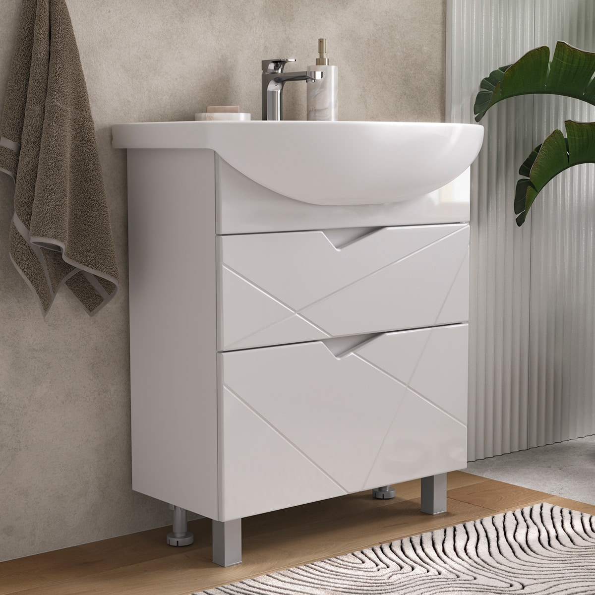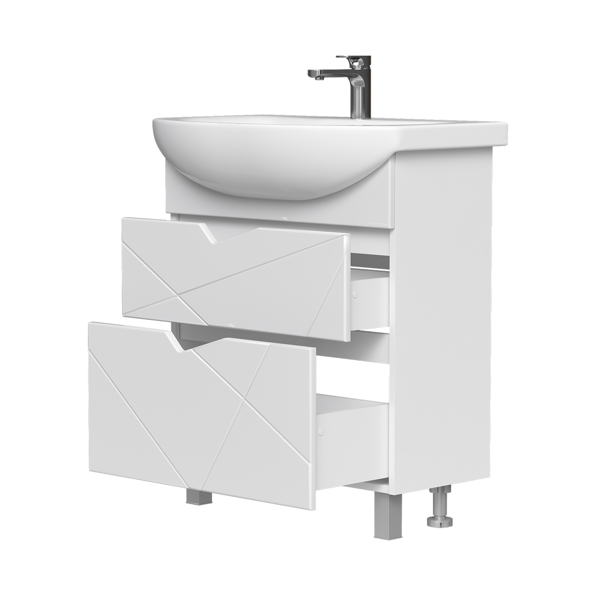 Напольная тумба с двумя выдвижными ящиками с направляющими скрытого монтажа, оснащёнными системой плавного закрывания. Фасады тумбы с декоративной фрезеровкой изготовлены из МДФ и облицованы глянцевой пленкой ПВХ. Корпус сделан из влагостойкого ЛДСП. Ящики открываются при помощи фигурной вырезанной ручки.