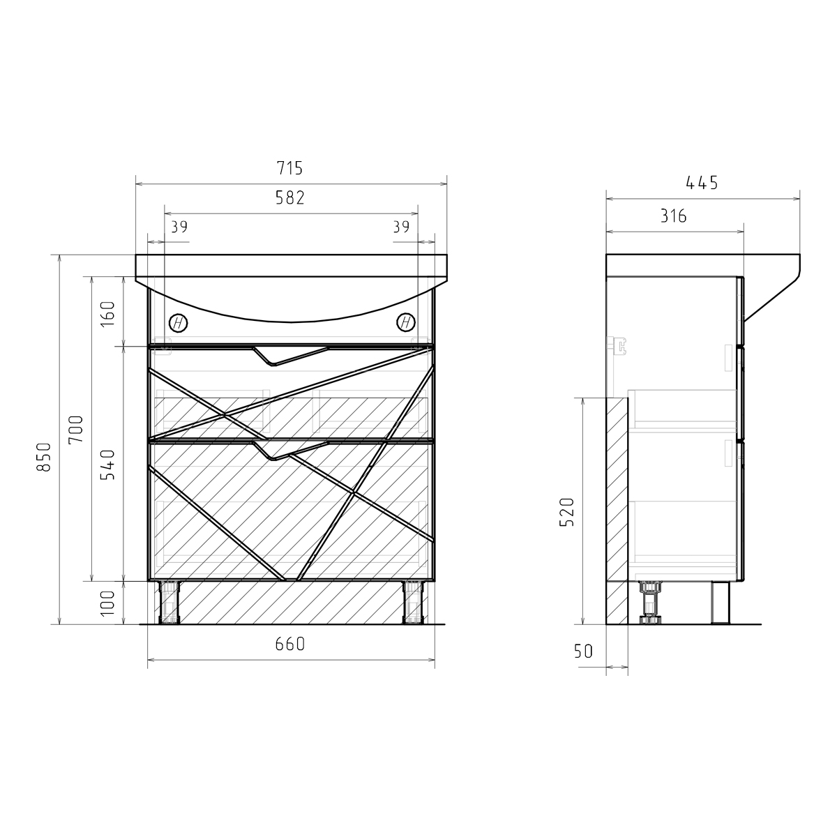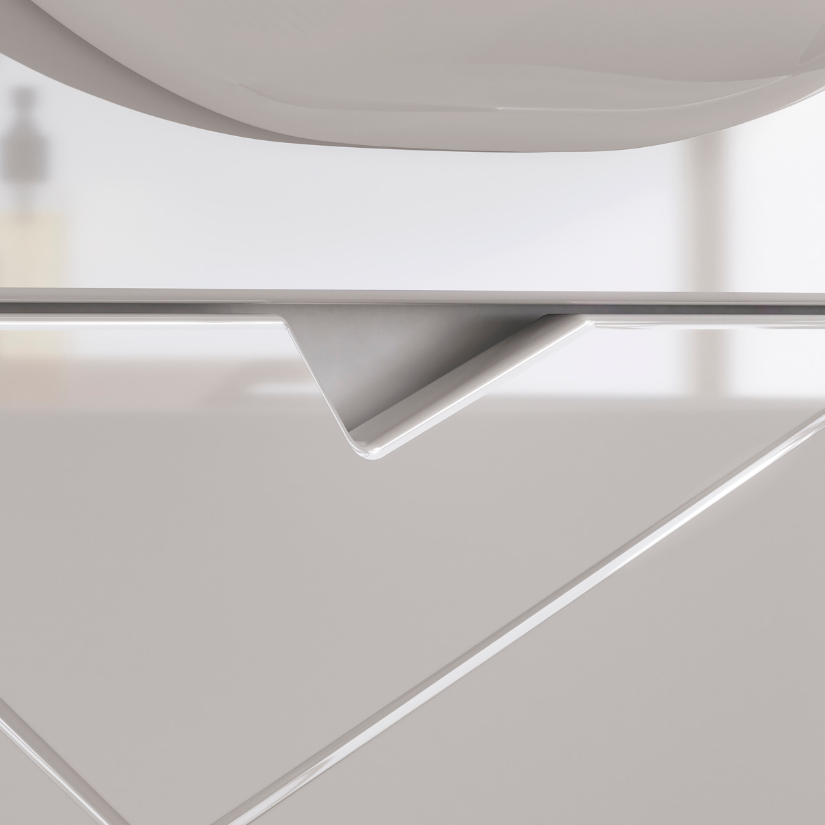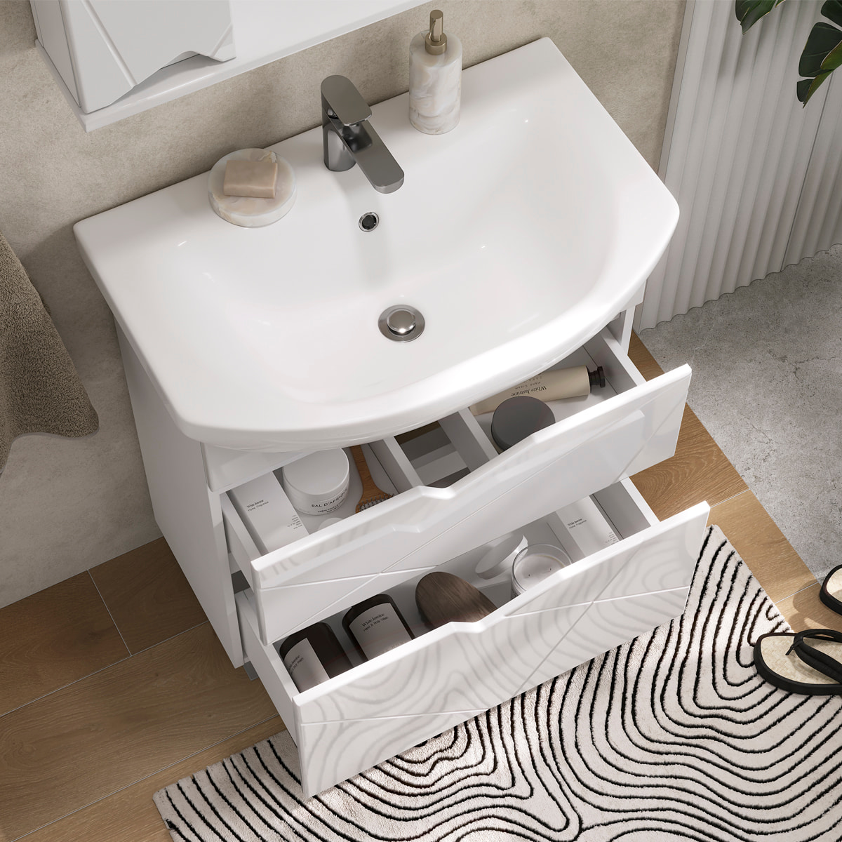 Напольная тумба с двумя выдвижными ящиками с направляющими скрытого монтажа, оснащёнными системой плавного закрывания. Фасады тумбы с декоративной фрезеровкой изготовлены из МДФ и облицованы глянцевой пленкой ПВХ. Корпус сделан из влагостойкого ЛДСП. Ящики открываются при помощи фигурной вырезанной ручки.