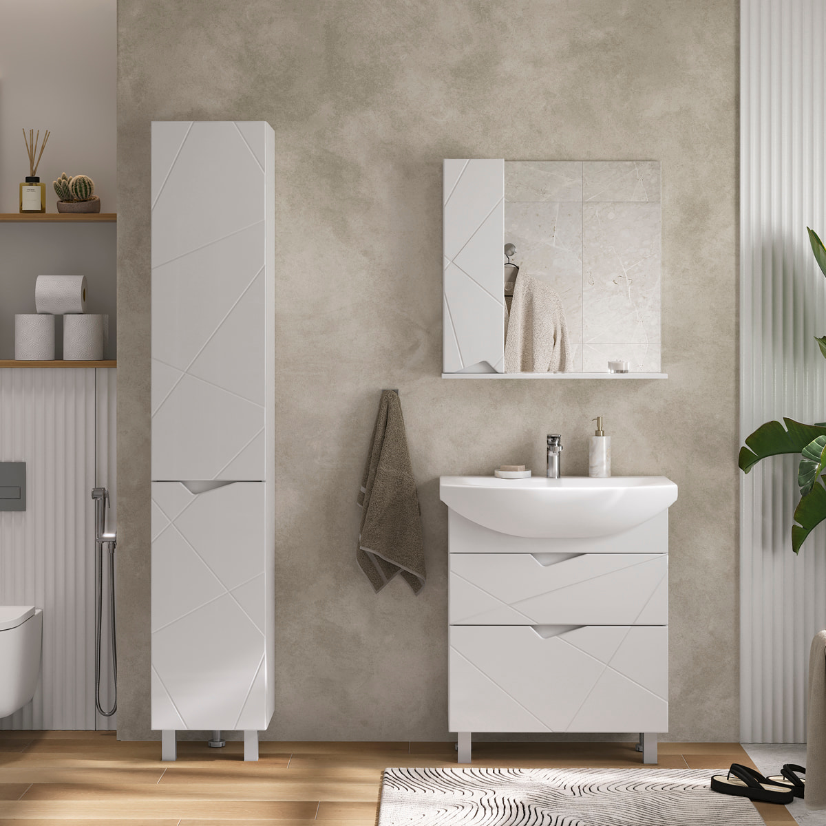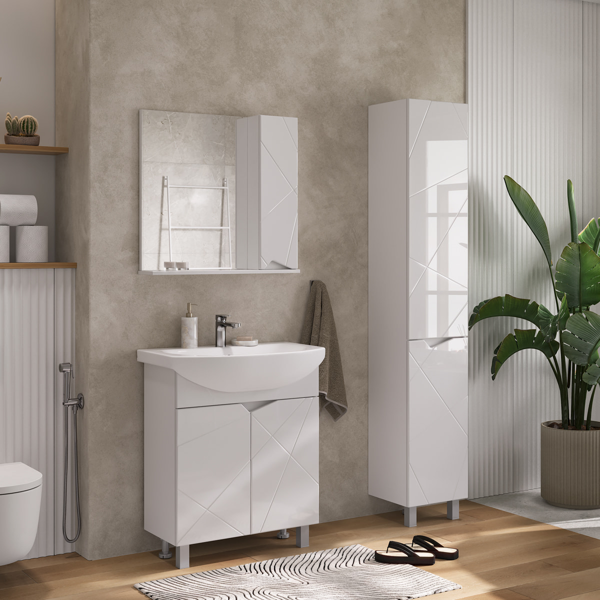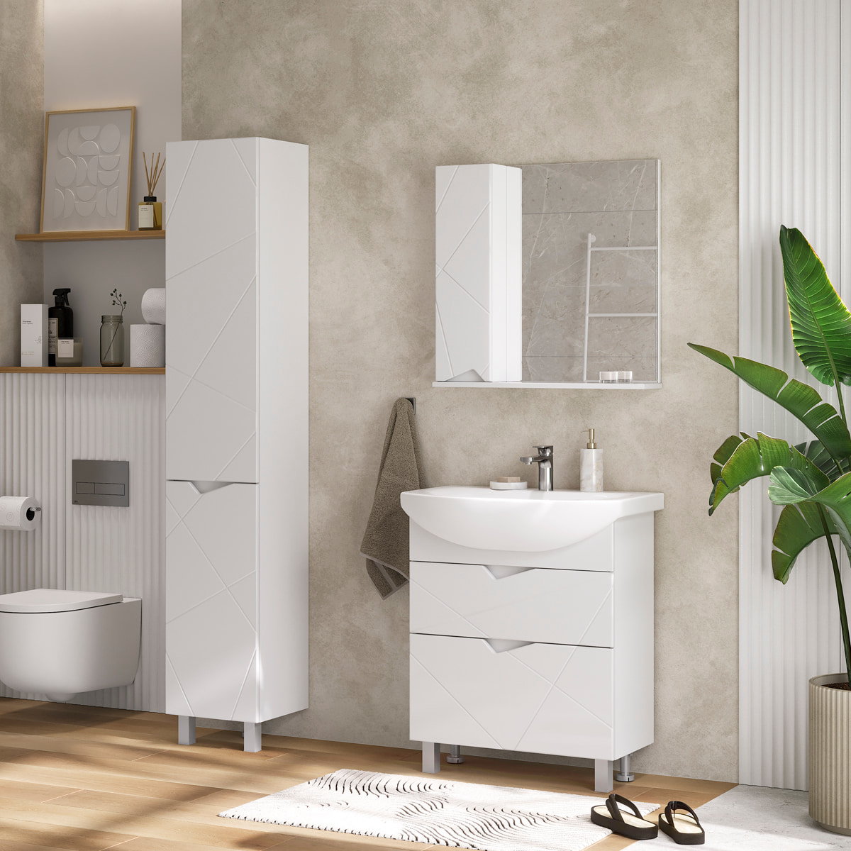 Напольный пенал с двумя полками из ЛДСП в верхней секции и одной полкой из ЛДСП в нижней секции. Фасады пенала с декоративной фрезеровкой изготовлены из МДФ и облицованы глянцевой пленкой ПВХ. Петли на дверцах оснащены доводчиками. Корпус пенала сделан из влагостойкого ЛДСП. Дверки открываются при помощи фигурной вырезанной ручки. Пенал устанавливается на две регулируемые опоры и фиксируется к стене при помощи креплений.