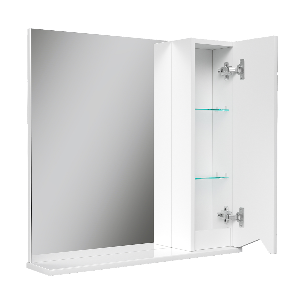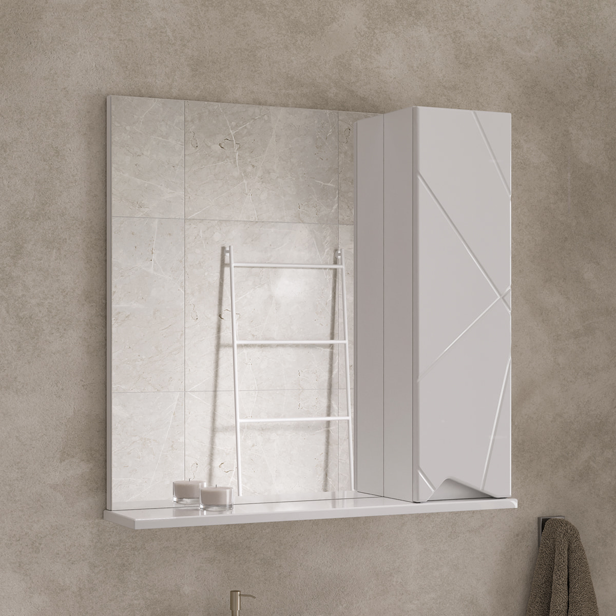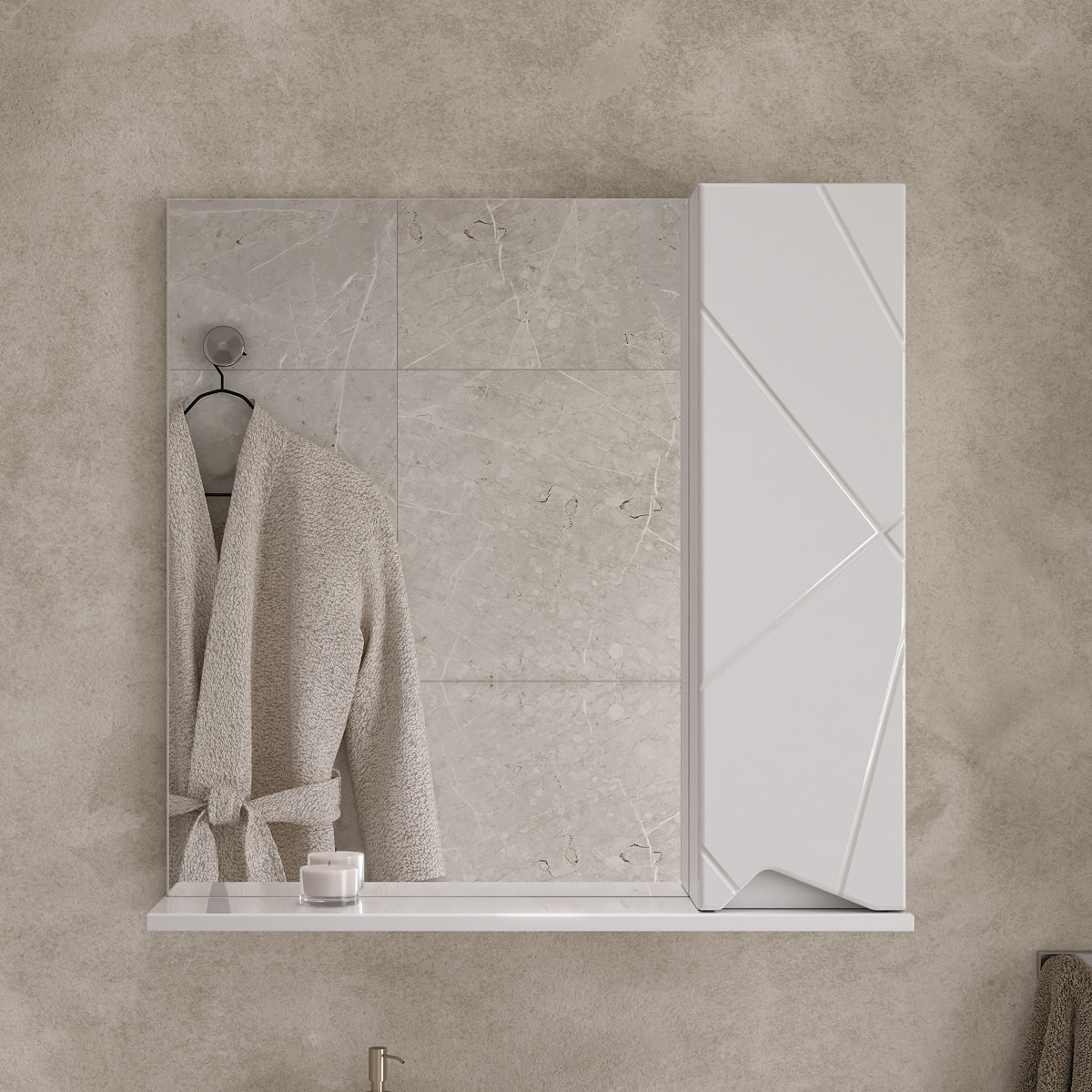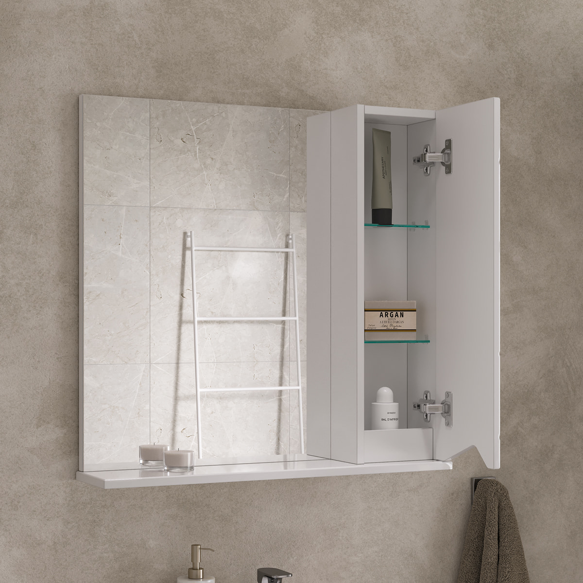 Зеркало-шкаф с двумя стеклянными полками за распашной дверцей. Петли на дверцах оснащены доводчиками для плавного закрывания. Фасад с декоративной фрезеровкой и основание зеркального шкафа изготовлены из МДФ в пленке ПВХ. Корпус изготовлен из влагостойкого ЛДСП. Дверка открывается при помощи вырезанной фигурной ручки.