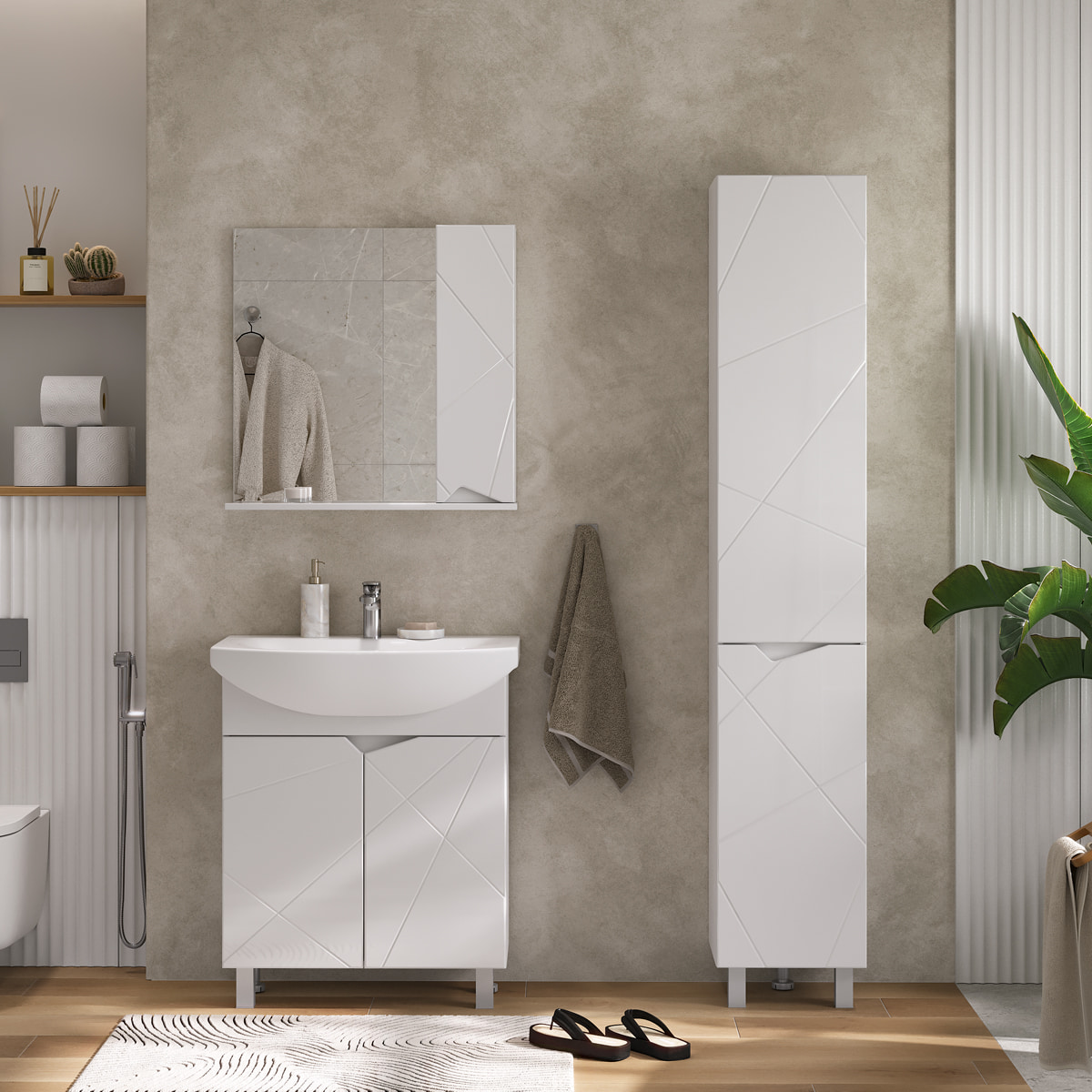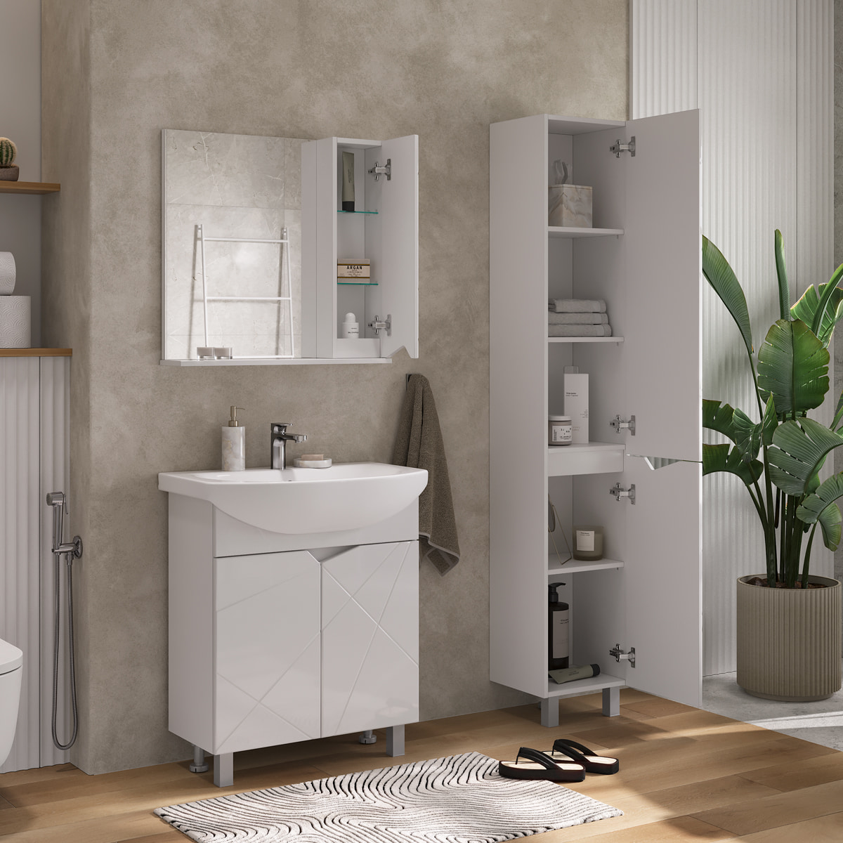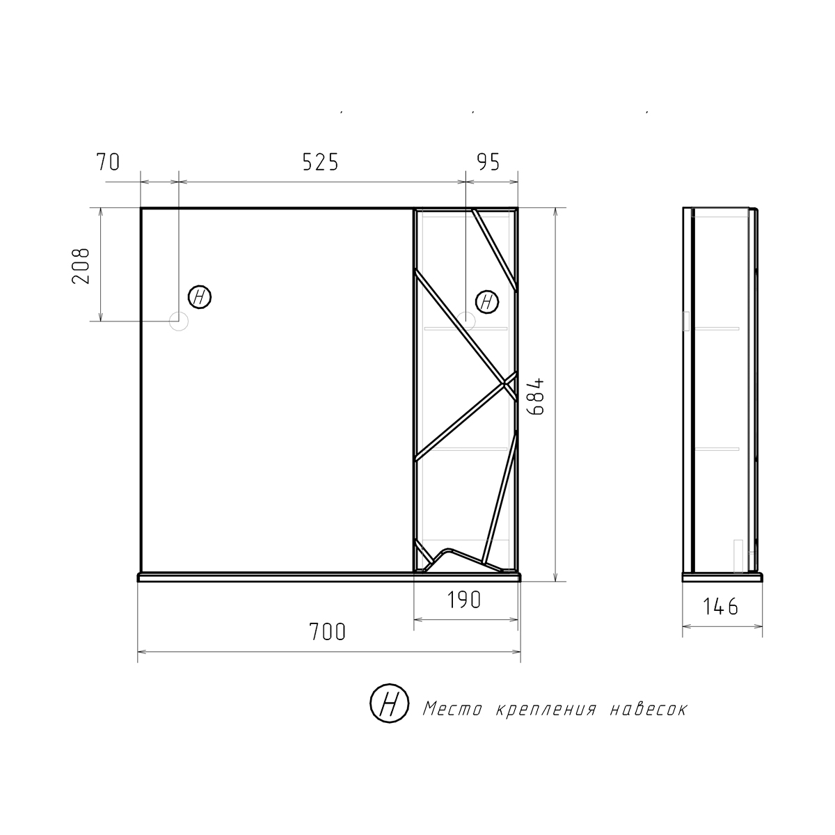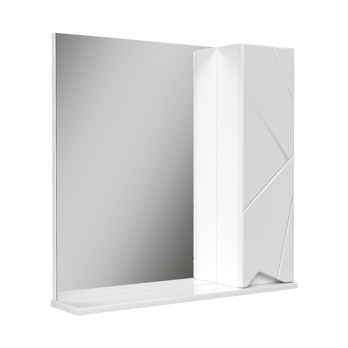 Зеркало-шкаф с двумя стеклянными полками за распашной дверцей. Петли на дверцах оснащены доводчиками для плавного закрывания. Фасад с декоративной фрезеровкой и основание зеркального шкафа изготовлены из МДФ в пленке ПВХ. Корпус изготовлен из влагостойкого ЛДСП. Дверка открывается при помощи вырезанной фигурной ручки.