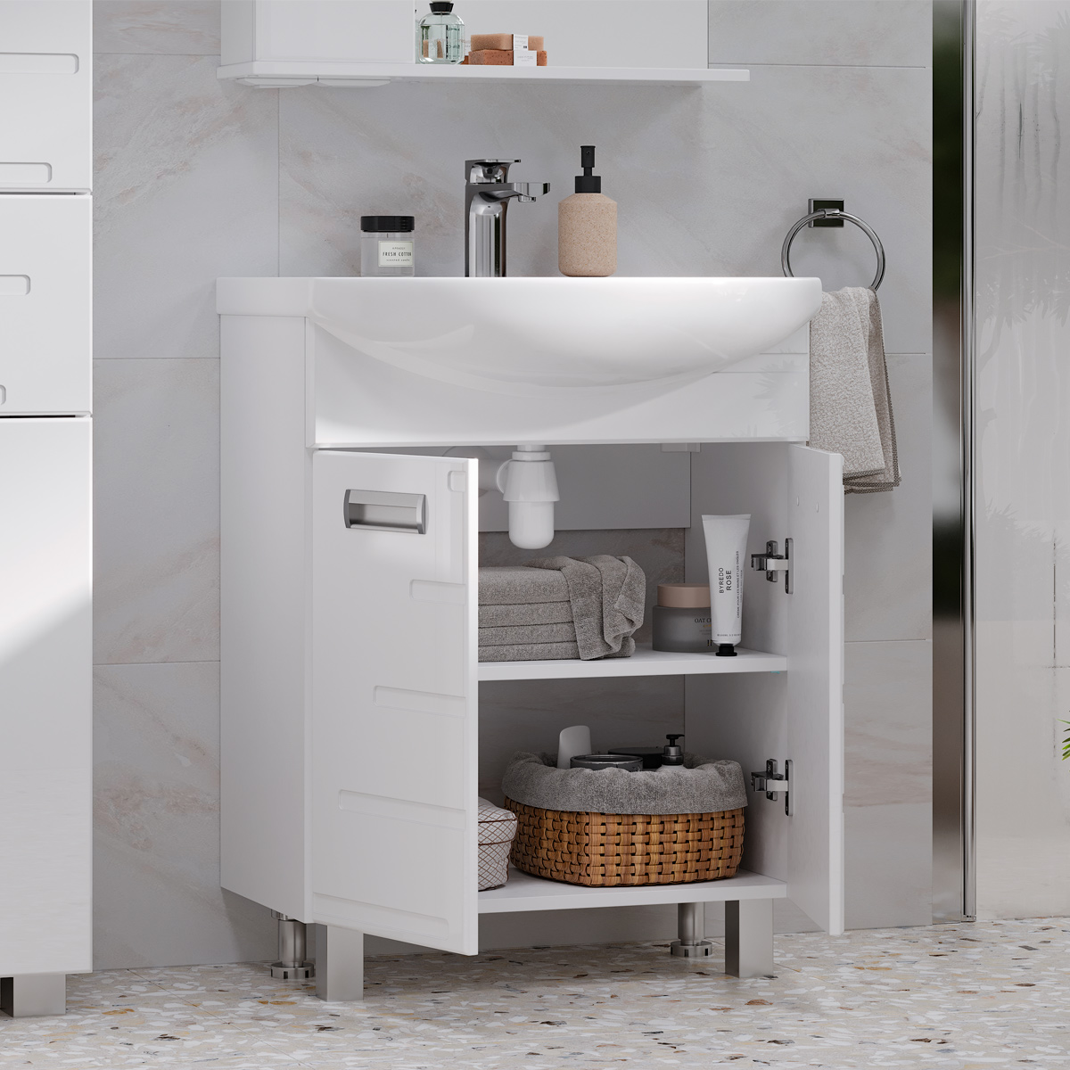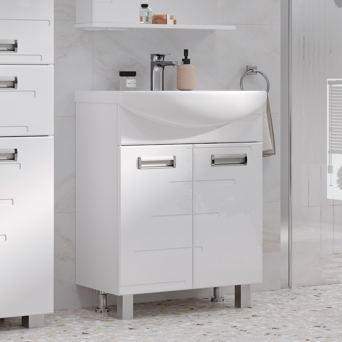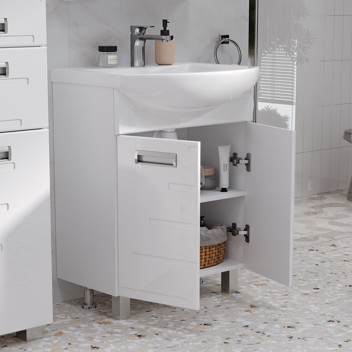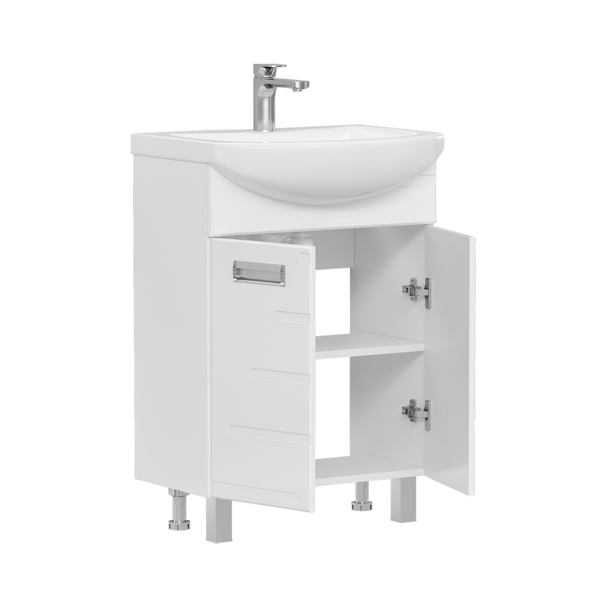 Напольная тумба с двумя распашными дверцами. Для хранения внутри предусмотрена полка из ЛДСП. Петли на дверцах оснащены доводчиками для плавного и бесшумного закрывания. Фасады с декоративной фрезеровкой изготовлены из МДФ и облицованы глянцевой пленкой ПВХ. Корпус тумбы сделан из влагостойкого ЛДСП.