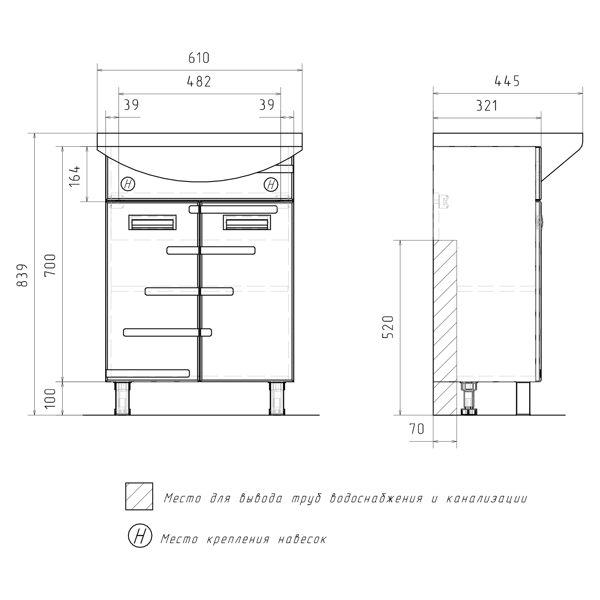 Лицевая фурнитура представлена врезными металлическими ручками в цвете серебро/хром. Тумба устанавливается на четыре регулируемые опоры (две лицевые и две монтажные) и фиксируется к стене при помощи креплений. После установки монтажные опоры можно убрать.