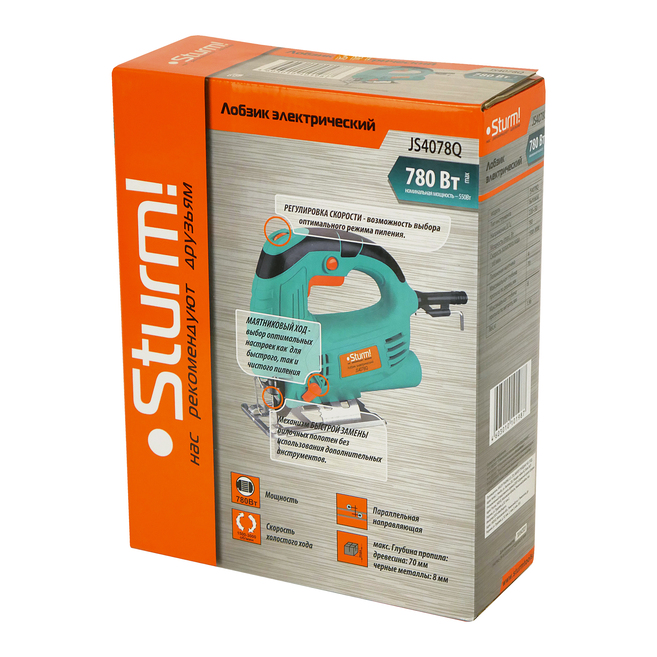 Sturm JS4078Q – компактный и практичный электрический лобзик. Инструмент характеризуется небольшими массогабаритными показателями и выверенной эргономикой – модель надежна в хвате и отлично контролируется даже одной рукой. Лобзик оснащен 780 Вт электромотором и надежной механической частью – позволяет выполнять пропилы до 70 мм в древесине и до 8 мм в металле.
