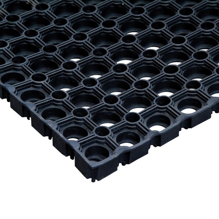 Резиновые коврики изготовлены из натурального каучука. Данный тип покрытий рекомендуется для оснащения придверных зон общественных зданий, торговых центров. Ячеистые коврики характеризуются высокой стойкостью к износу, устойчивы к действию ультрафиолета, низких температур, что допускает их уличное применение. Хорошо справляется с обильным «грязевым коктейлем» от снега.