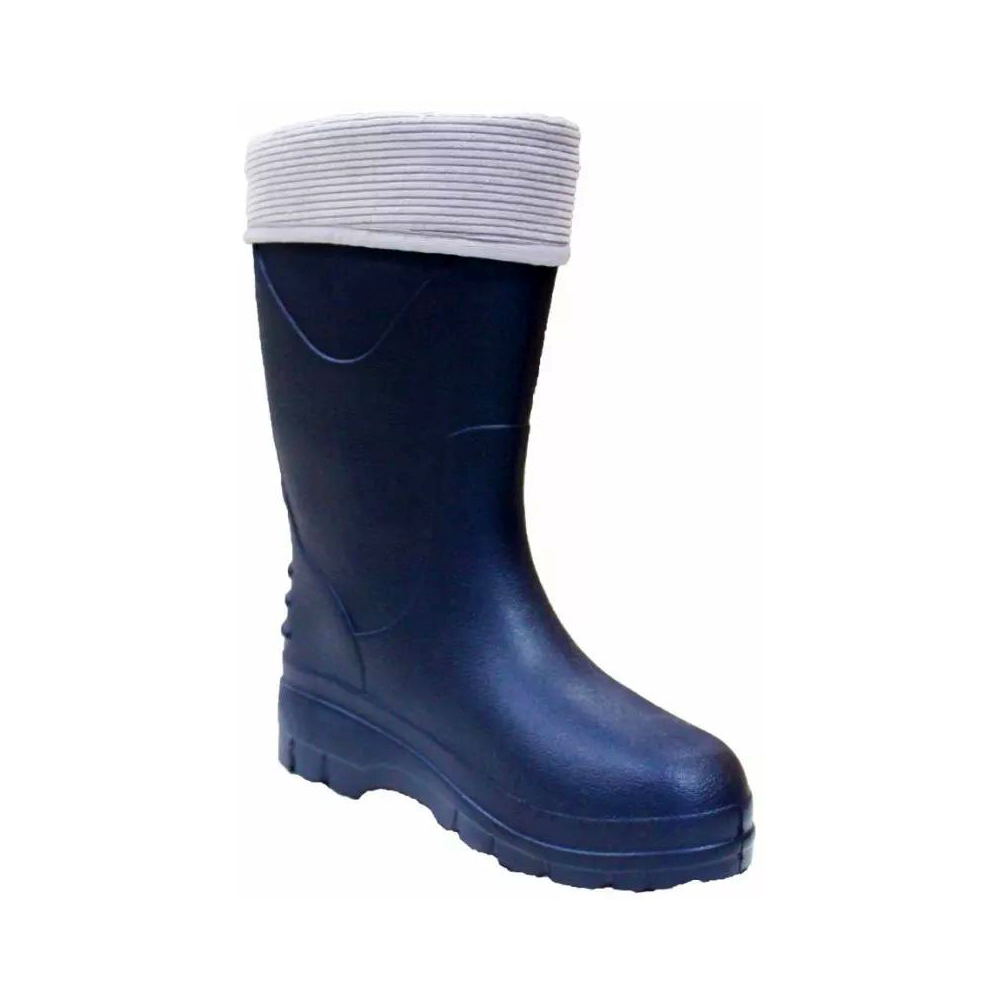 Модель изготовлена из легкого и водонепроницаемого материала ЭВА, который не пропускает влагу, легко очищается и обладает долгим сроком службы. Внутри сапог расположен съемный утепленный чулок. Его трехслойная конструкция из нетканого полотна, пенополиуретана и мягкого флиса эффективно сохраняет тепло и обеспечивает комфорт для стопы. Манжет из вельвета дополняет модель, мягко фиксируя голень.