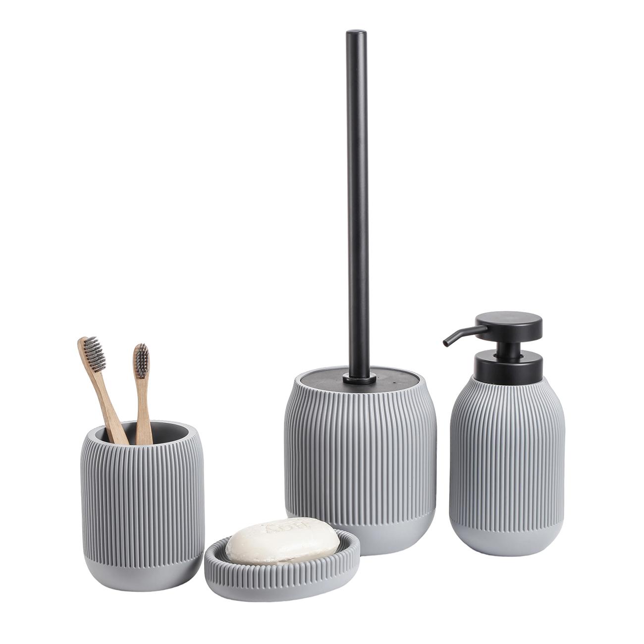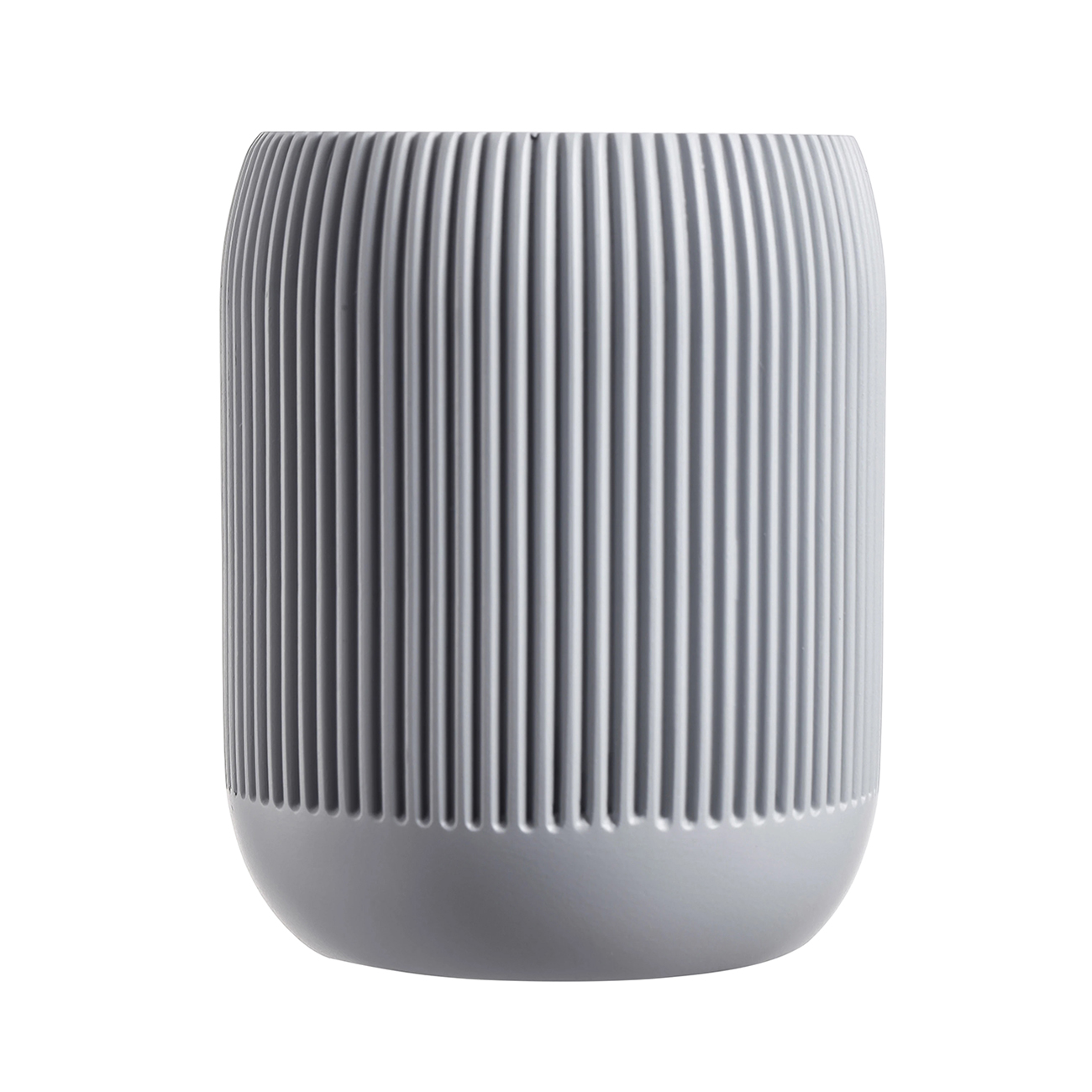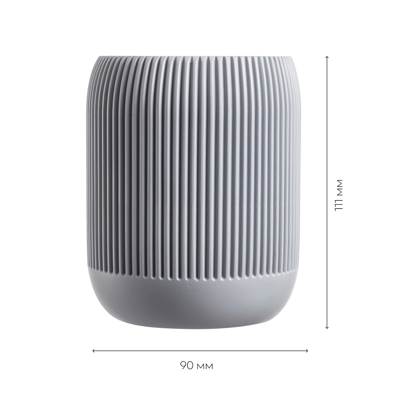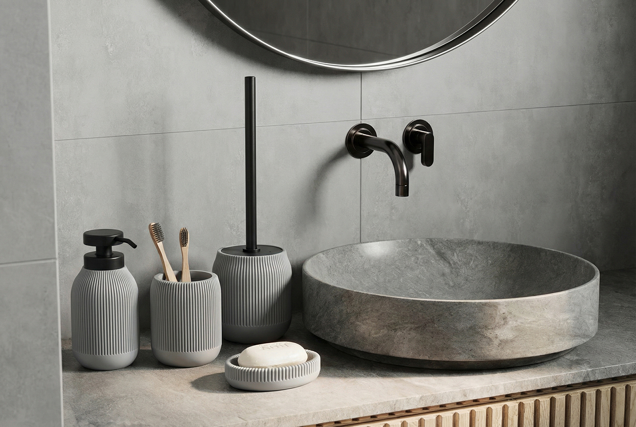 Настольный стакан BONNA из полирезина в пепельно-сером цвете — аккуратный акцент для современной ванной. Мягкая ребристая фактура добавляет тактильности и делает дизайн более “дорогим”, при этом остаётся практичной в уходе. Подходит для зубных щёток, пасты и мелочей у раковины: материал устойчив к влаге и перепадам температур, легко очищается водой.