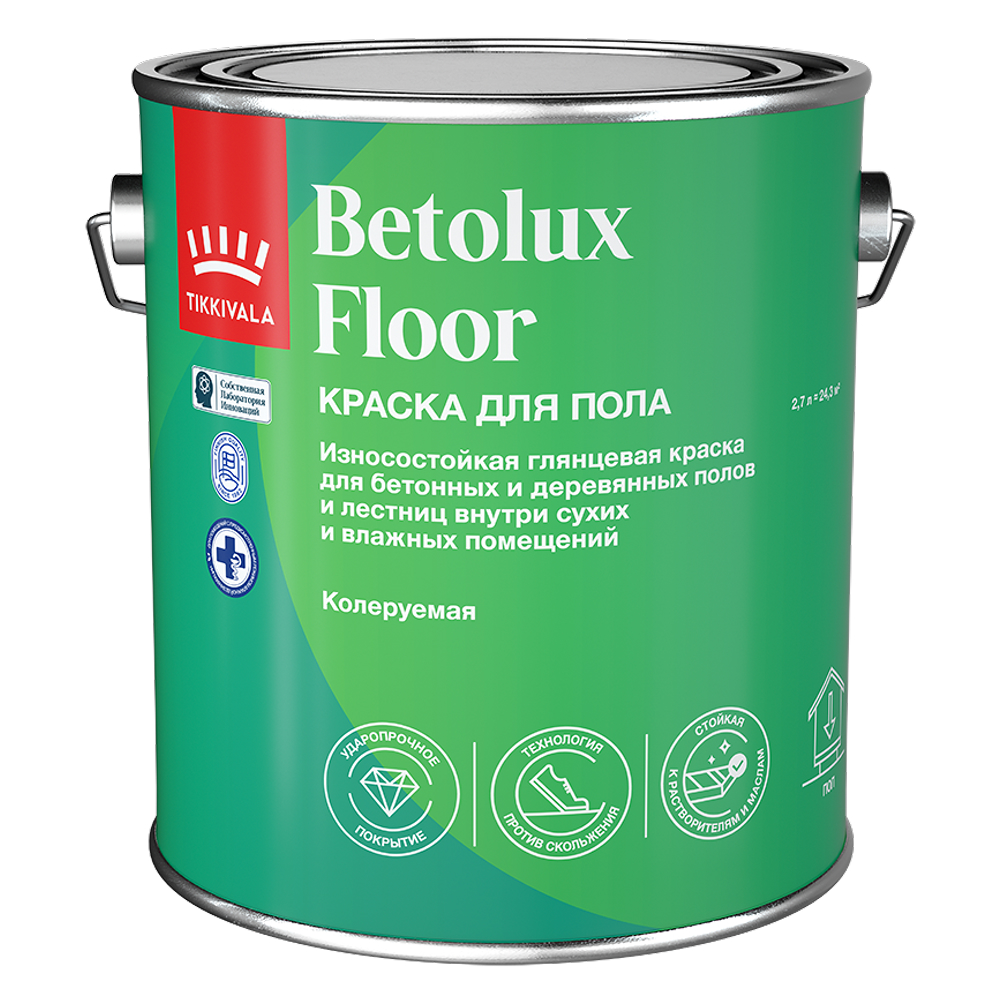 Tikkivala Betolux Floor - износостойкое глянцевое покрытие для бетонных и деревянных полов и лестниц внутри сухих и влажных помещений. Предназначена для окраски бетонных и деревянных полов внутренних помещений, включая бетонные полы во влажных помещениях. Можно применять для ремонтной окраски полов, ранее окрашенных алкидными или эпоксидными красками или лаками.