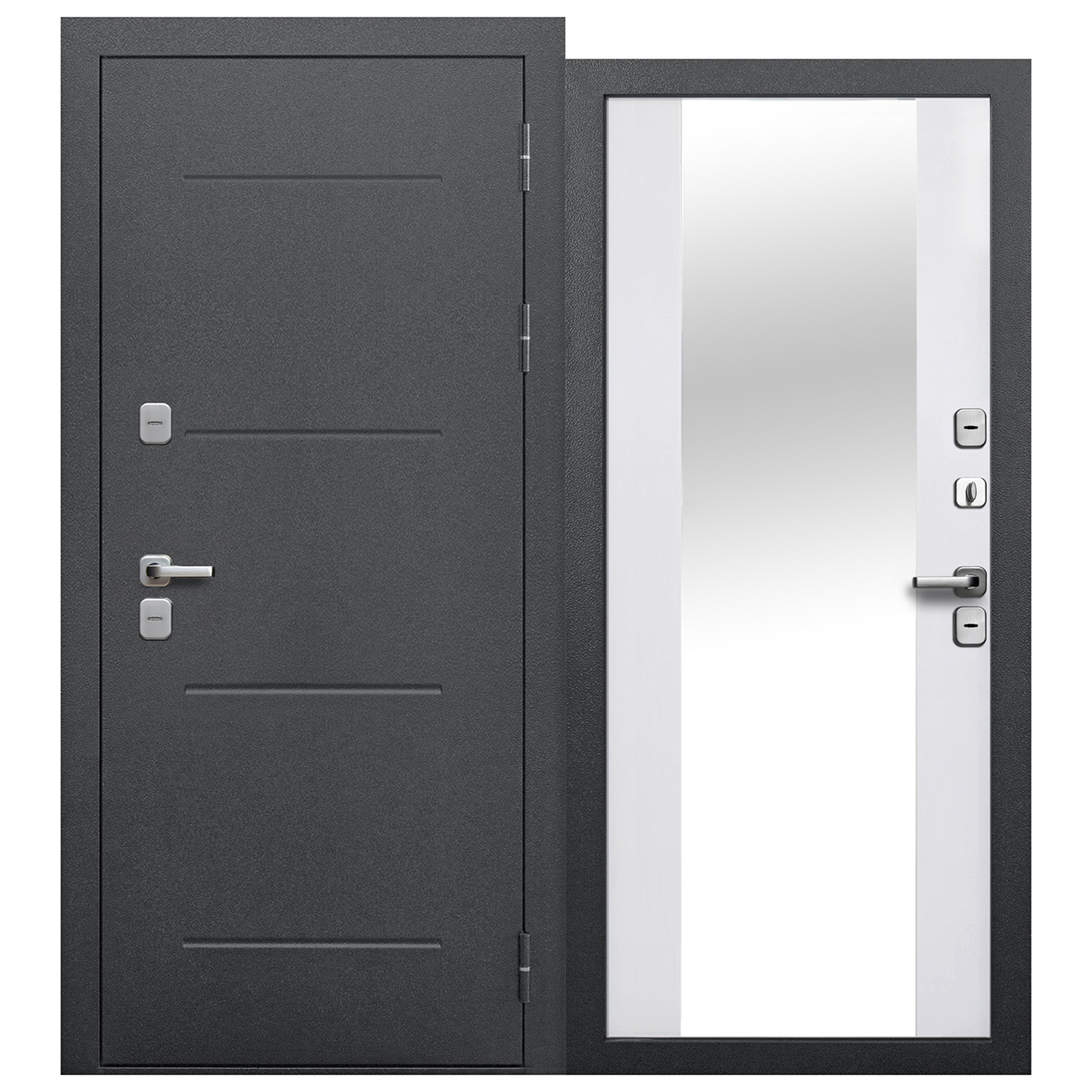 Стальная дверь толщиной 110 мм с глубиной короба 137 мм сочетает высокую взломостойкость и продуманную теплоизоляцию. Внешнее покрытие выполнено атмосферостойким порошково-полимерным покрытием «антик серебро», внутренняя сторона отделана МДФ-панелью 10 мм с зеркалом в цвете «эмалит белый». Конструкция оснащена терморазрывом 24 мм на базе двухкамерного ПВХ-спейсера, наполнена пенополистиролом и защищена тремя контурами уплотнителя из вспененной резины (два на полотне, один на коробе), что обеспечивает надежную защиту от холода и шума.
